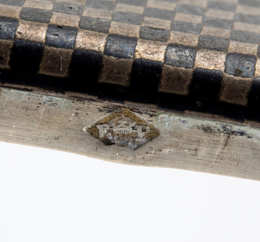 a) di forma rettangolare con doppia apertura superiore, interamente niellato a motivi geometrici; punzonato con la serie completa di marchi per l'argento al titolo di 900/1000 in uso in Austria Ungheria dal 1886 al 1822.