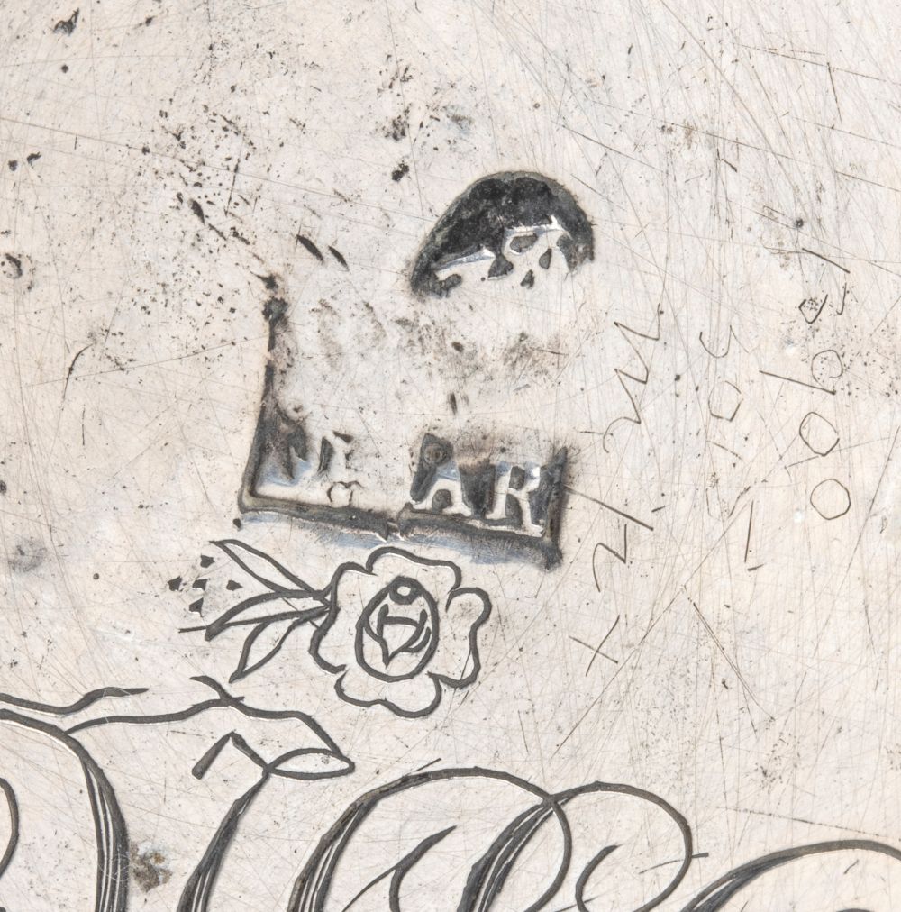 di forma colindrica sbalzato e cesellato con profili all'antica. Punzonato con marchi non identificati.