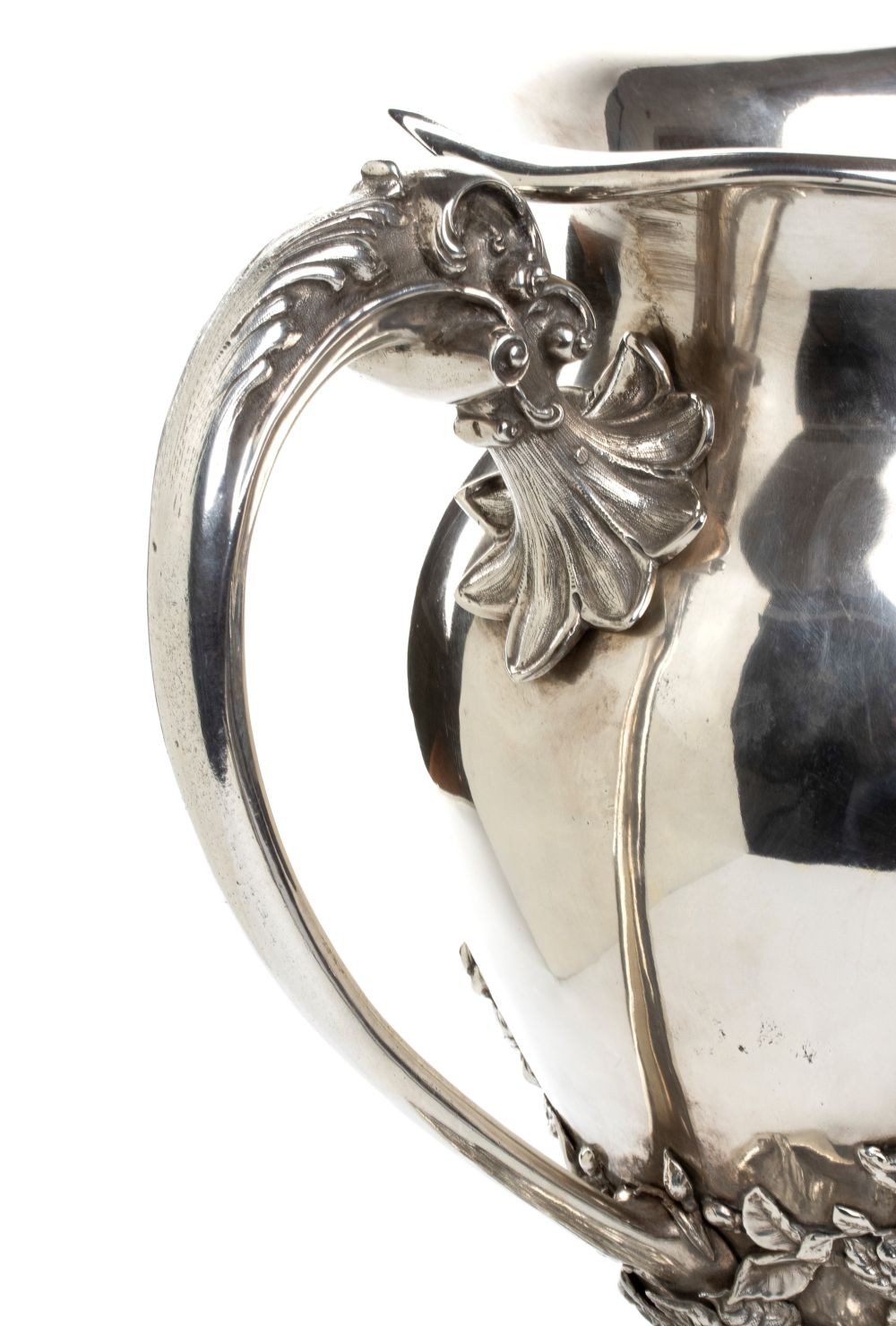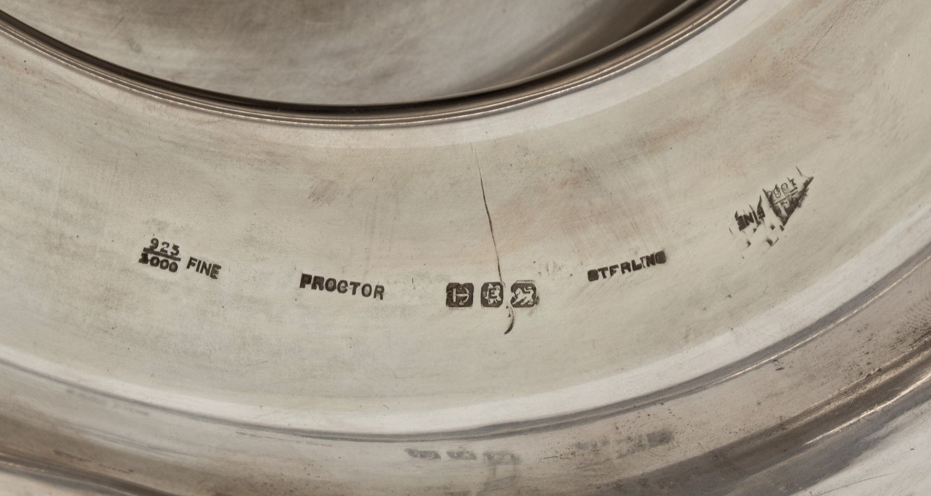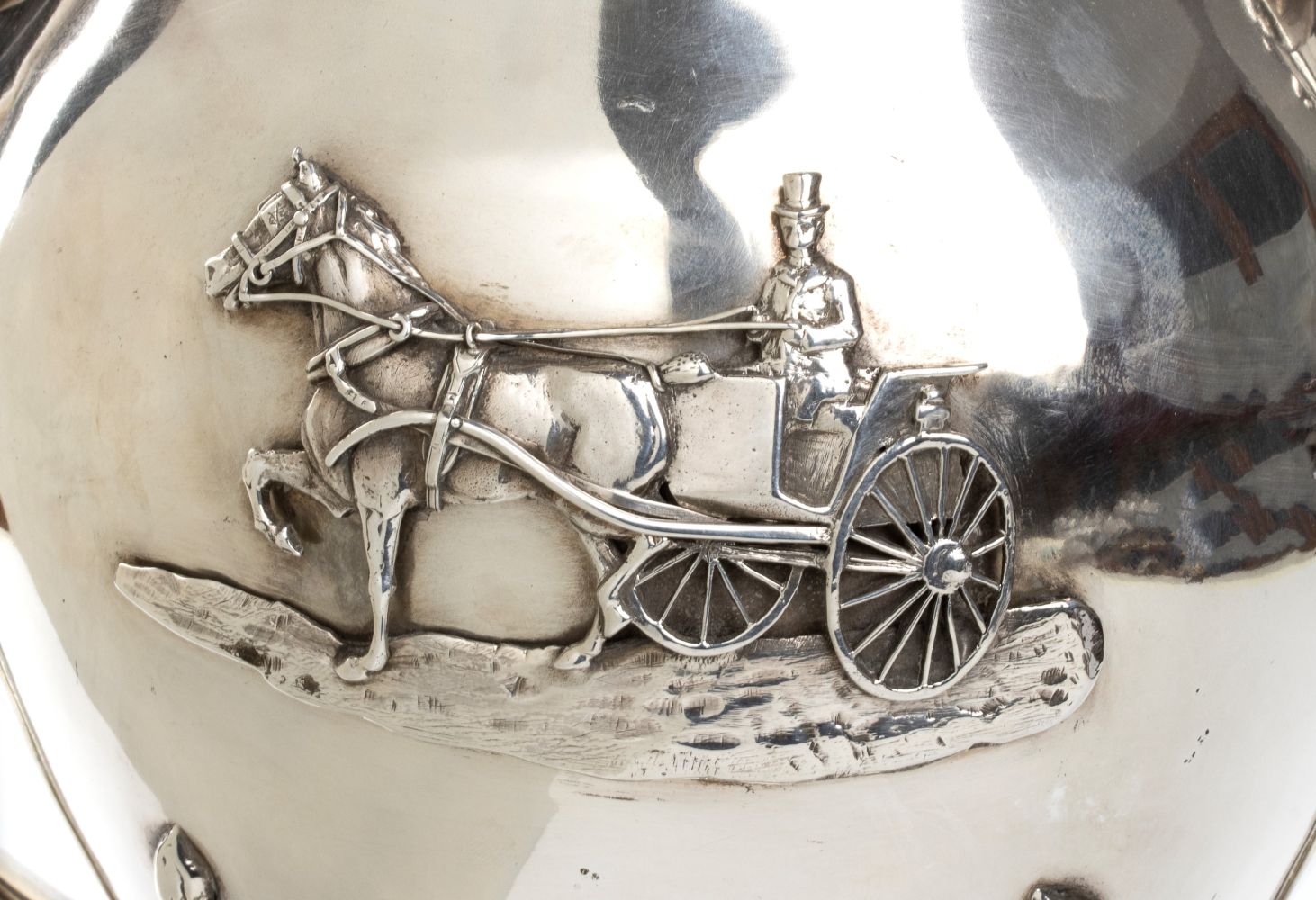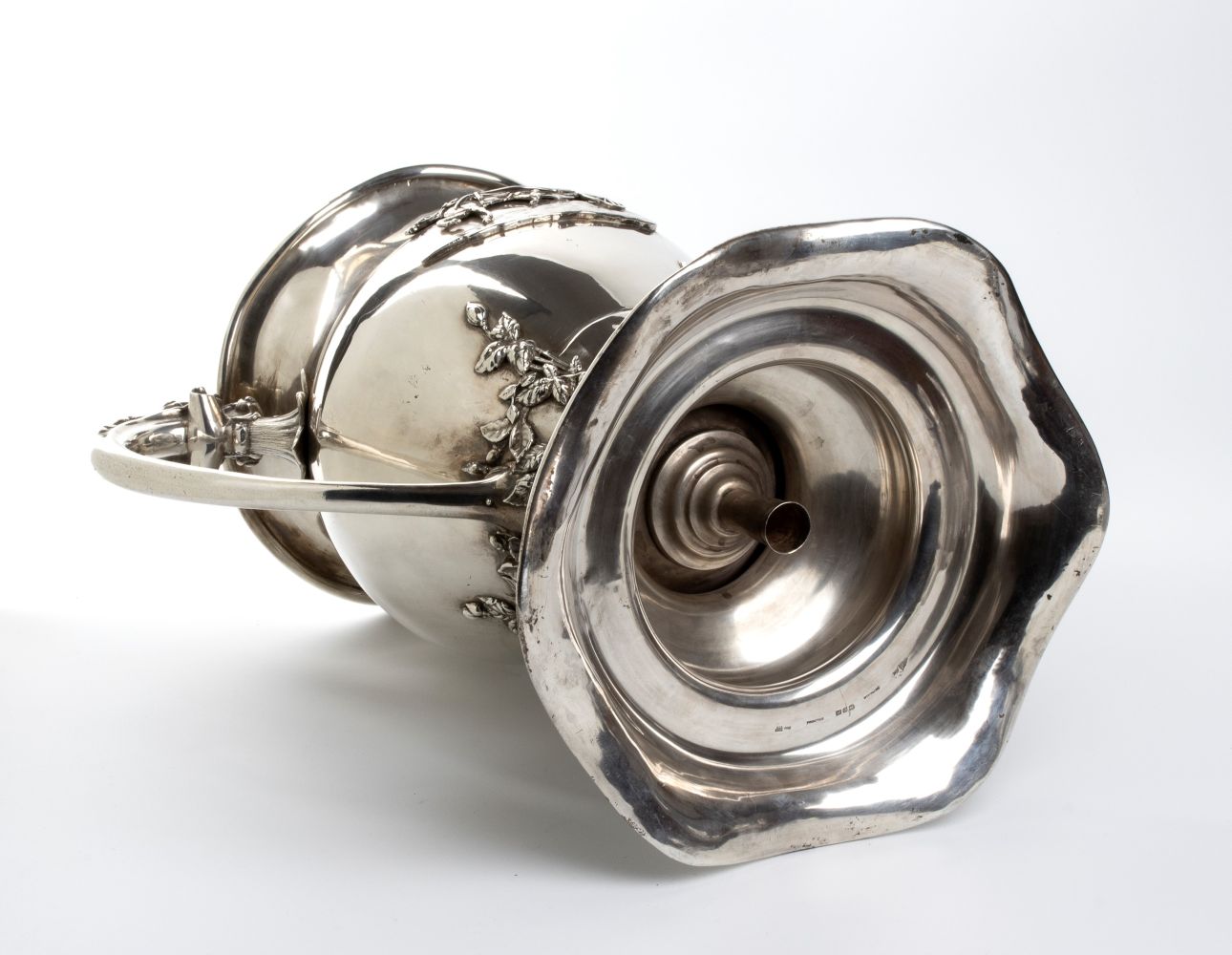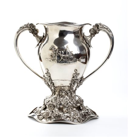 Su una base a cupola a gradini con bordo ondulato applicato con fiori rampicanti e fogliame; sul corpo è applicato su un lato un cavallo che traina una carrozza, sul lato opposto è incisa una iscrizione di presentazione; i manici ad anello con cappuccio a foglia e terminali superiori a fiore. Argento 925/00, punzonata "925/1000 Fine - Proctor - Sterling" e marchi P.W. Ellis & Co.