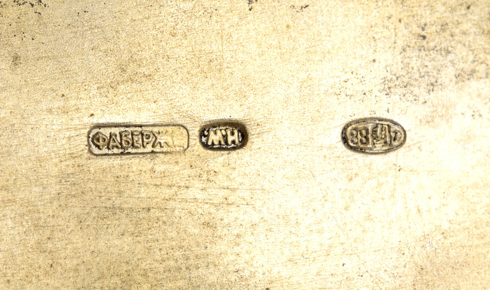 Punzonata con i marchi per l'argento al titolo di 88 zolotnik (916/1000) in uso a San Pietroburgo dal 1908 al 1917, con Fabergé in cirillico e le iniziali del maestro Henrik Wigström.