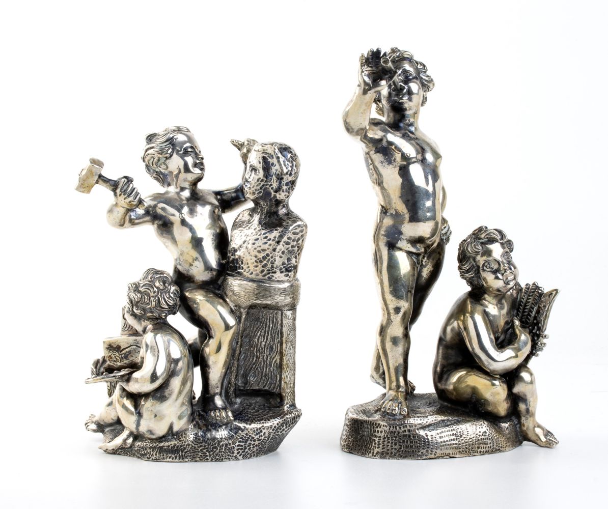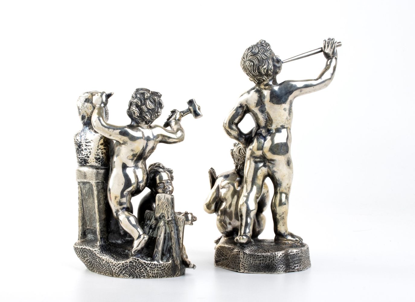 in argento fuso raffiguranti una coppia di putti musicanti, dotati di flauto e arpa, e una coppia di putti artisti, un pittore e uno scultore. Punzonati "800".