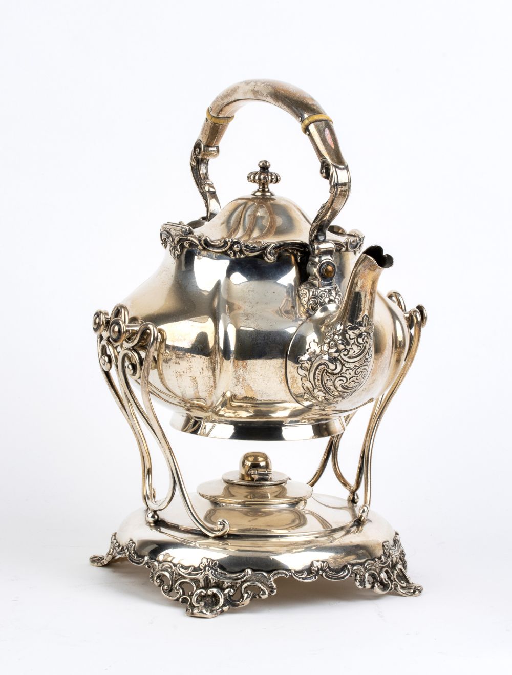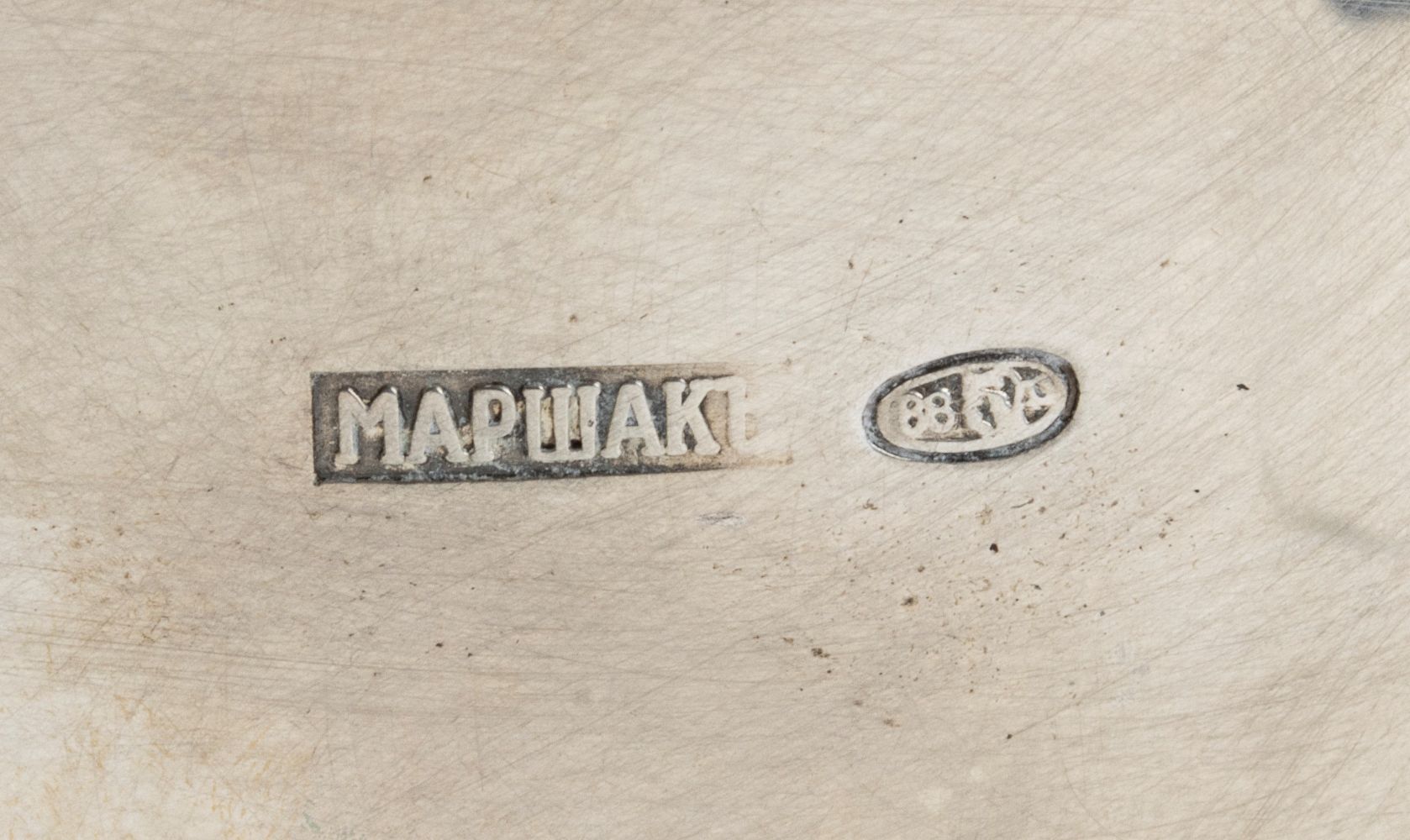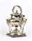 composto da Samovar con fornelletto, caffettiera, teiera, zuccheriera e lattiera. Argento 916/1000, punzonato con i marchi per l'argento al titolo di 88 zolotniks (916/1000) in uso in Russia dal 1908 al 1917.
