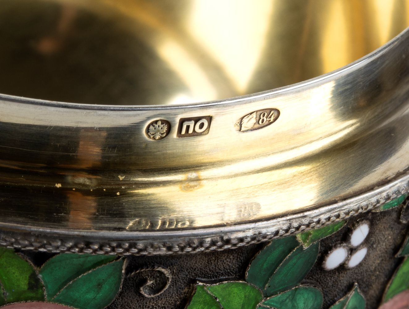 Punzonato con marchi apocrifi in uso a San Pietroburgo dal 1908 al 1917 per l'argento al titolo di 84 zolotnik (875/1000), argentiere Pavel Ovchinnikov.