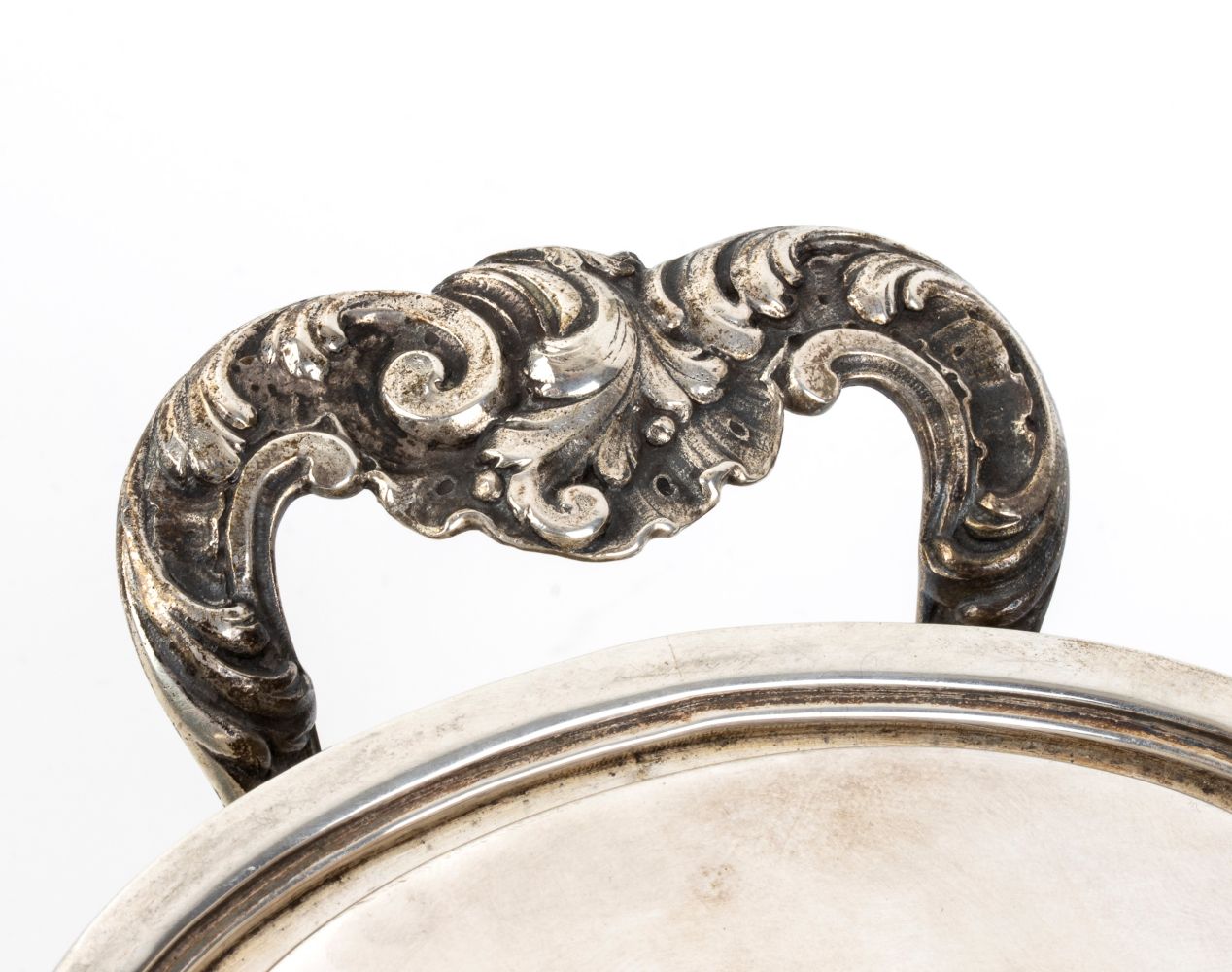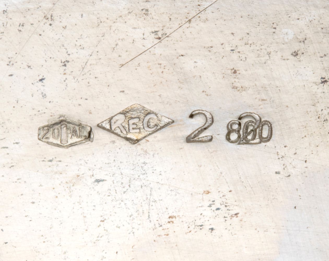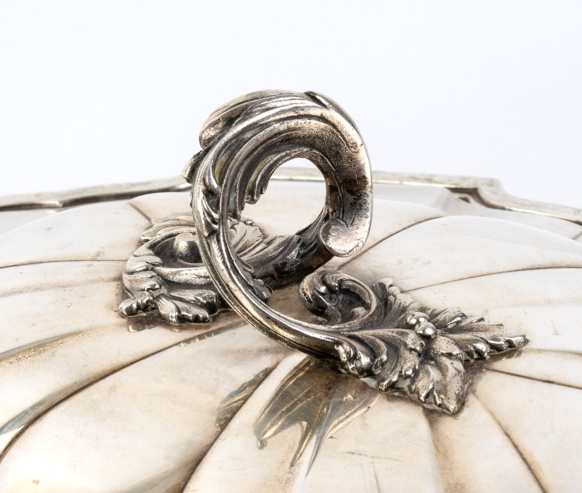 di forma ovale sagomata con manici laterali, coperchio con presa decorata con motivi di foglie. Argento 800/1000, punzonata "800 - ReC - 20 marchio del fascio AL", Argentiere Ricci & C. S. p. A.