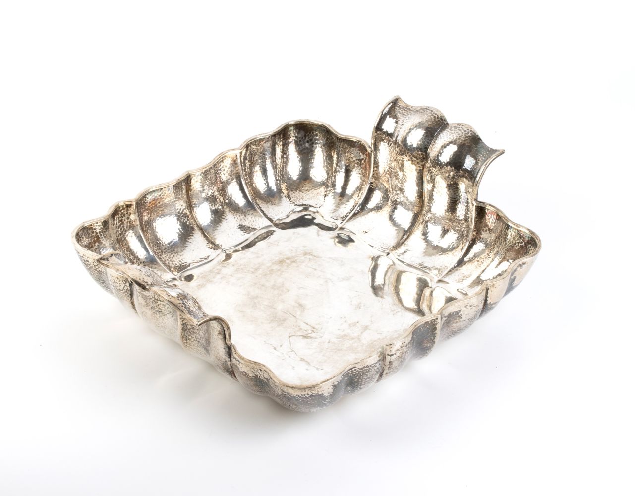 di forma quadrata con bordi rialzati e manici laterali dalle forme ondulate. Argento 800/1000, punzonato "800".