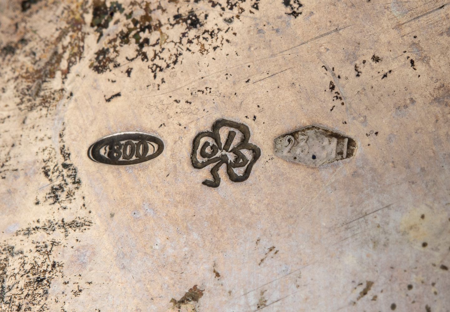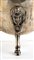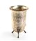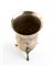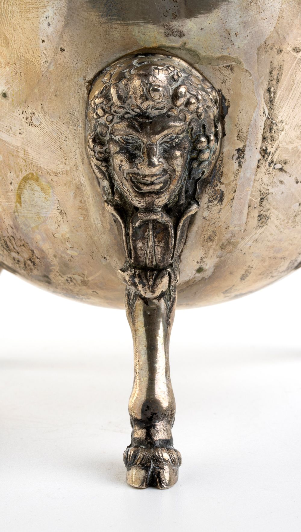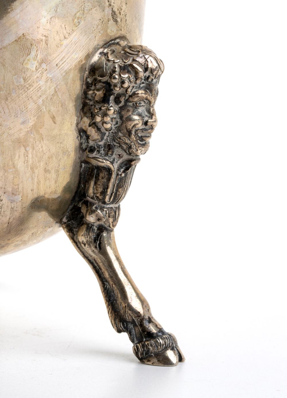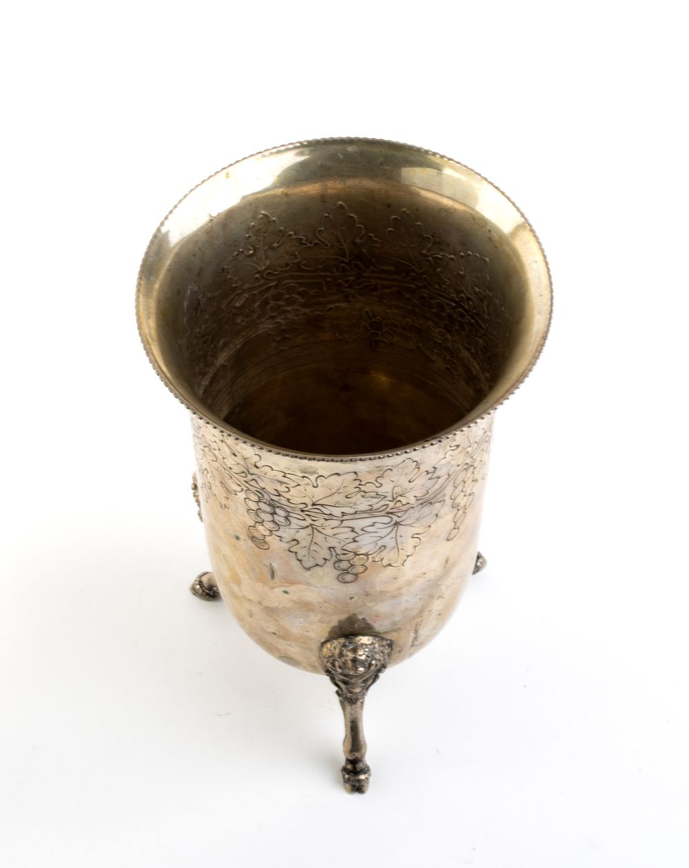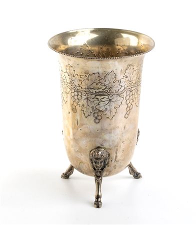 di forma cilindrica decorato con incisioni raffiguranti l'albero della vite e poggiante su tre piedi a forma di zoccolo animale sormontate da teste di Bacco. Argento 800/1000, punzonato "800 - OID - 23 MI", argentiere Luigi Genazzi.