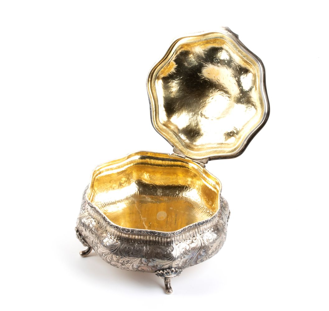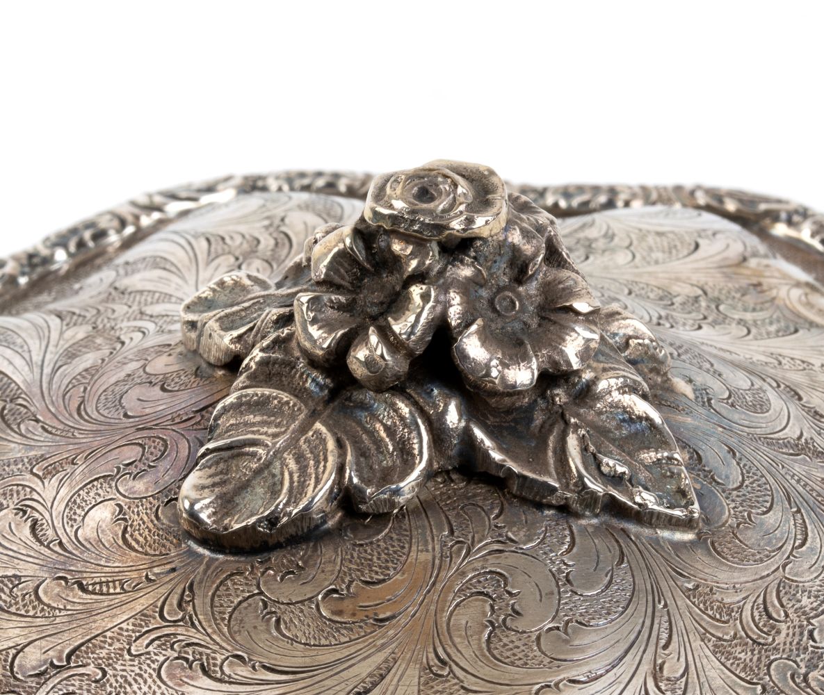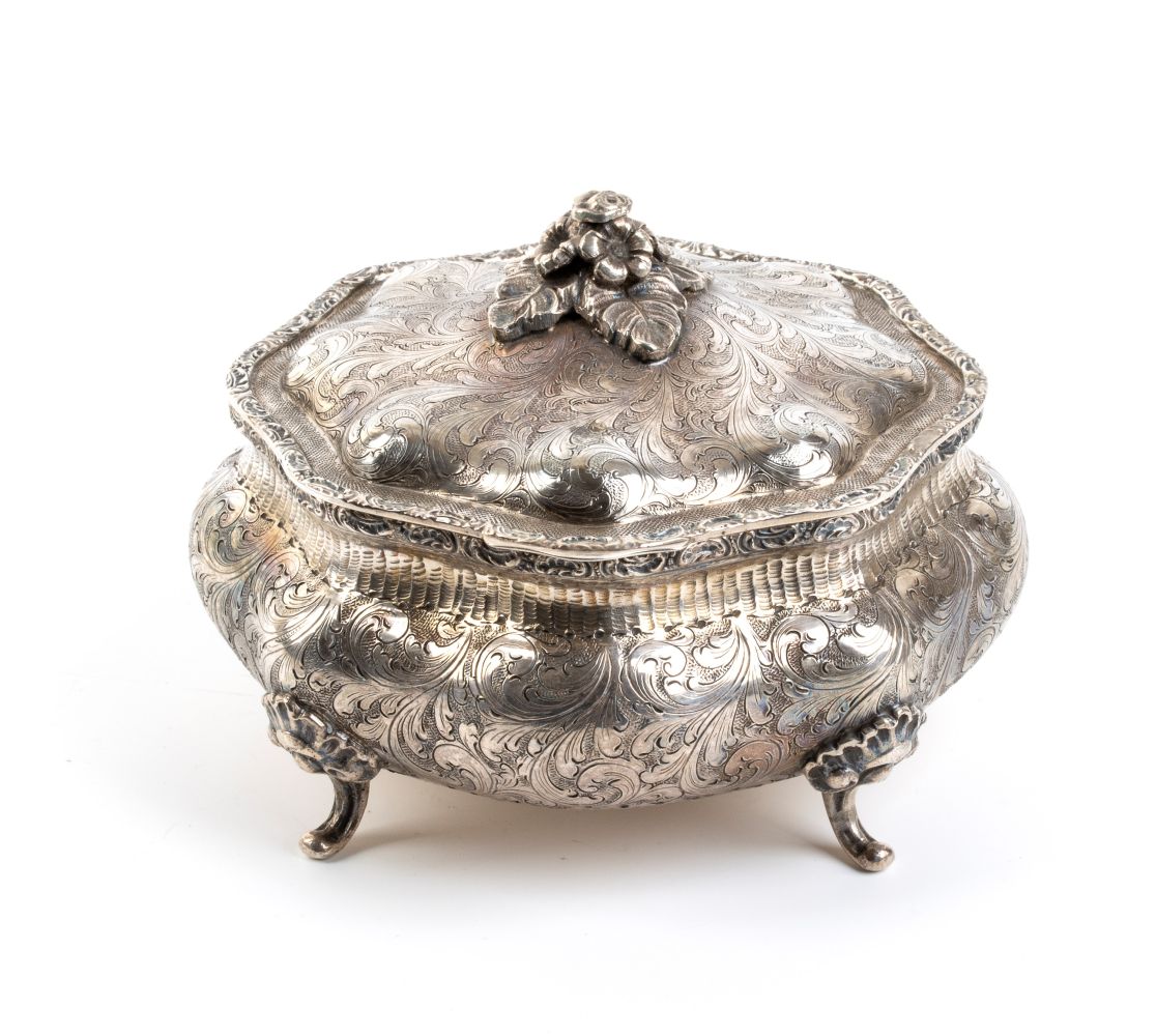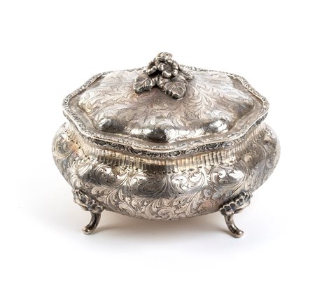 di forma rotonda con decorazioni floreali e coperchio con presa floreale. Argento 800/1000, punzonata "800".