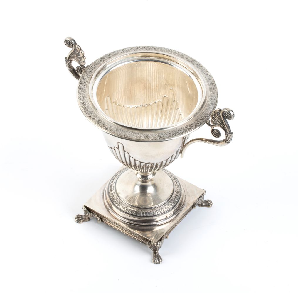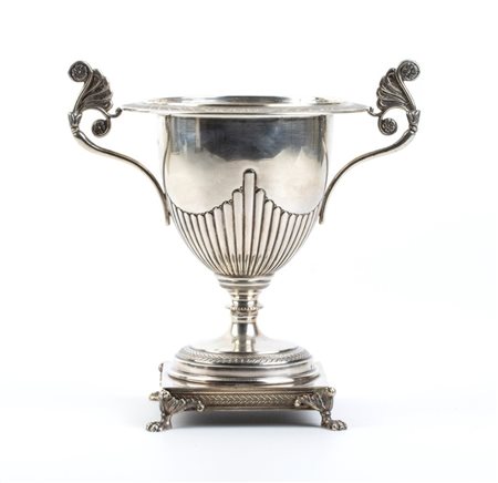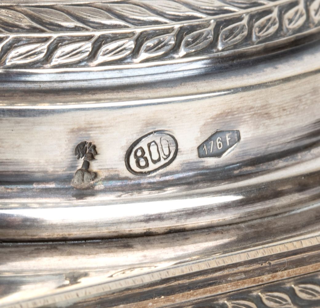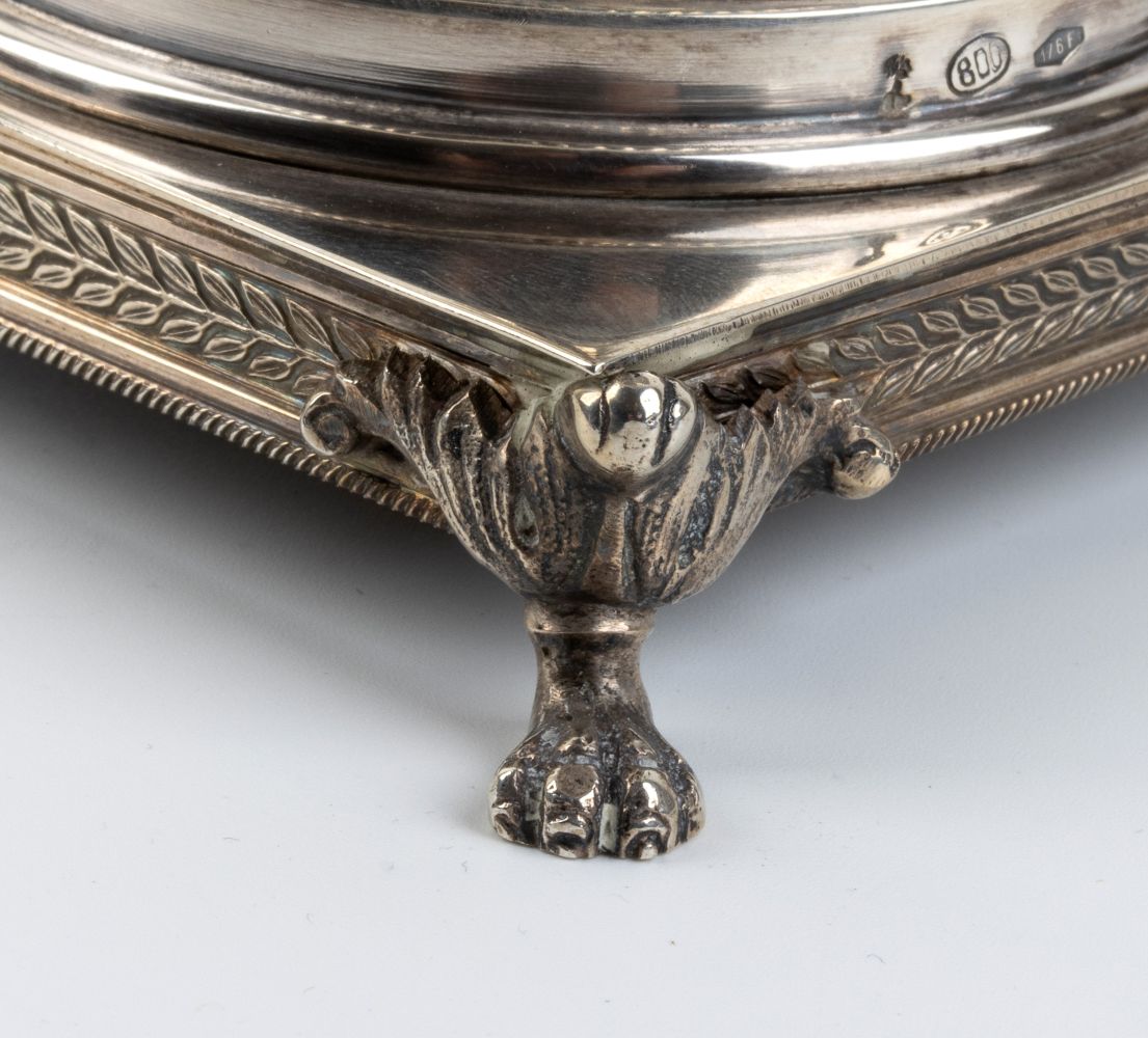 a base quadrata sorretta da quattro zampe leonine. Argento 800/1000, punzonata "800 - 176FI", argentiere Pampaloni Ermindo di Pampaloni Franco.