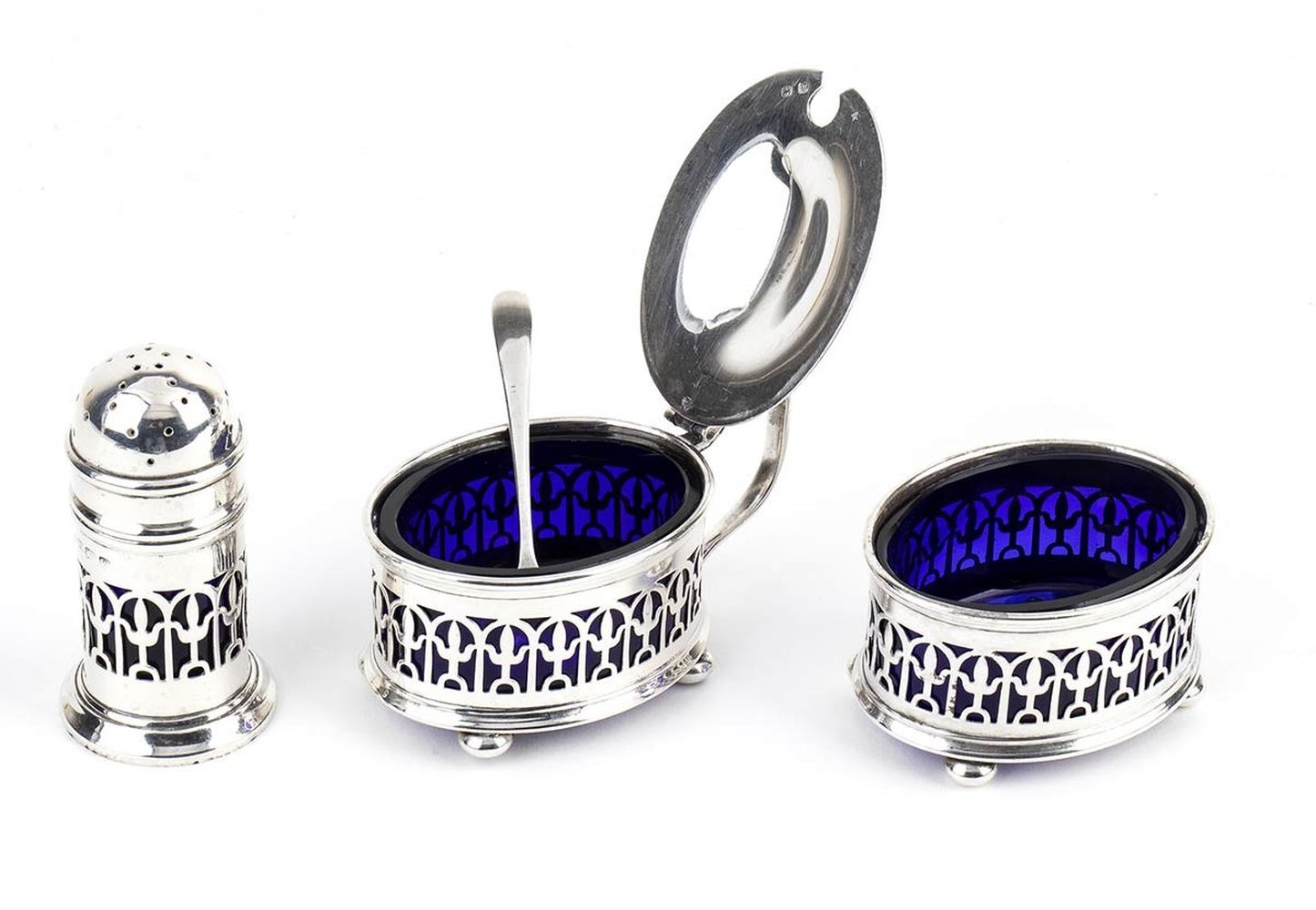 Saliera, pepiera e mostardiera inglesi in argento Birmingham 1921-1922