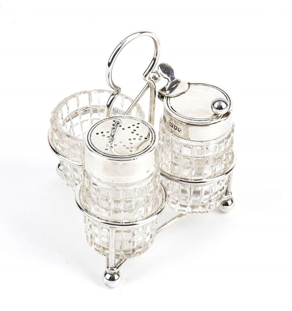 di forma triangolare con tre contenitori in vetro molato. Argento 925/1000, serie completa di marchi Londra 1901, argentieri Hukin & Heath, John Thomas Heath & John Hartswore Middleton.