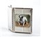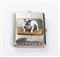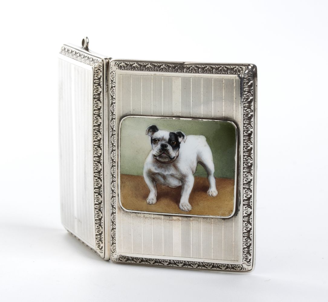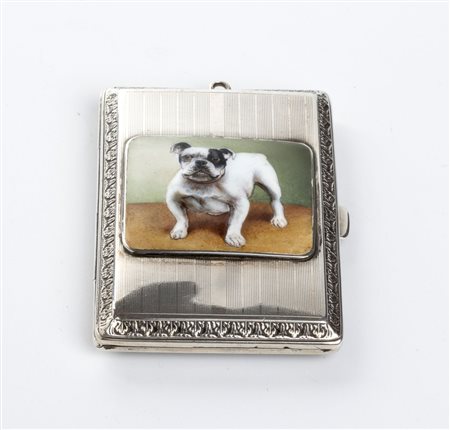 di forma rettangolare, il fronte con miniatura in smalti policromi raffigurante un cane. Apparentemente non punzonato.