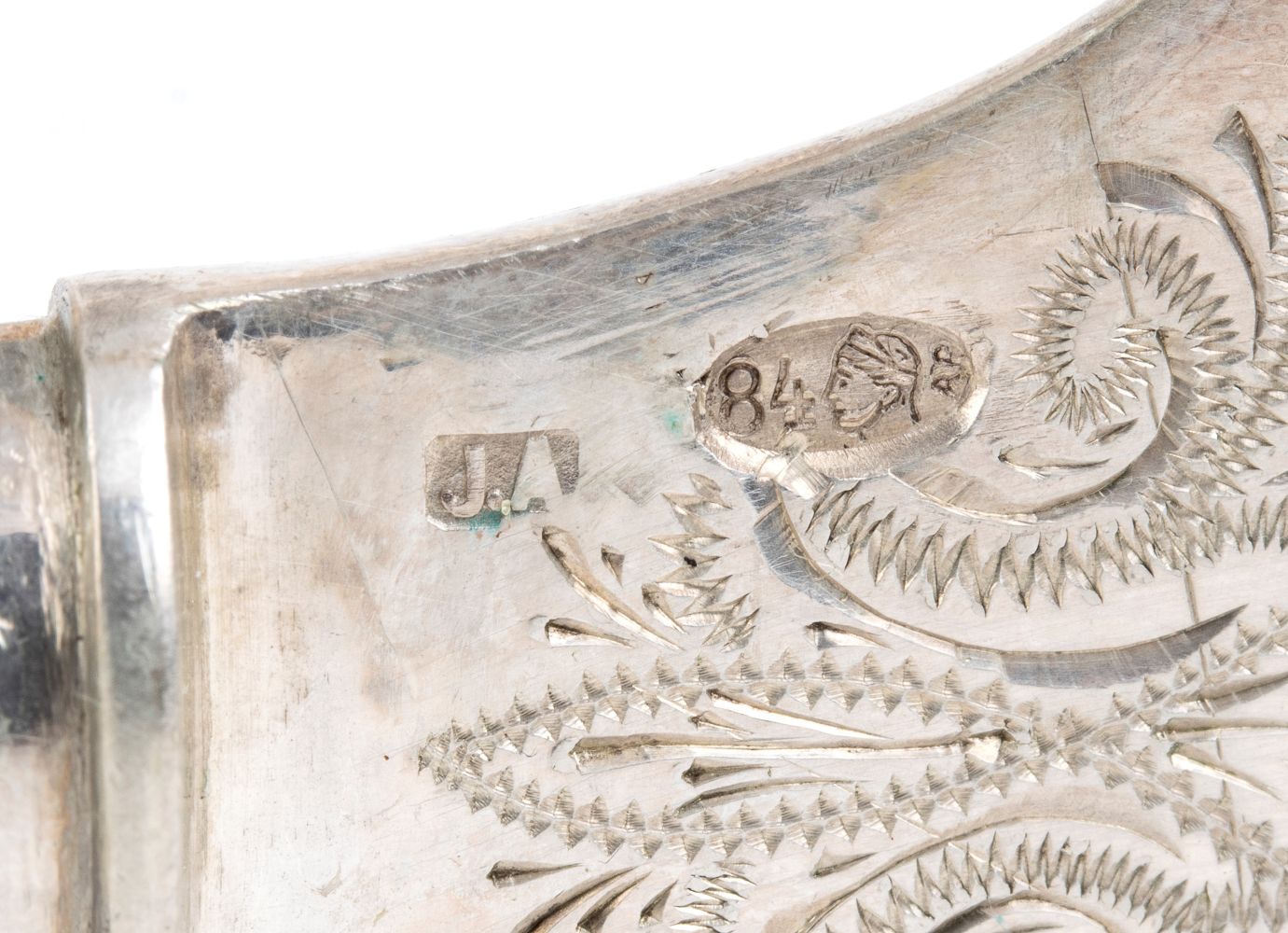 argento 875/1000. Punzonate con i marchi per l'argento al titolo di 84 zolotniks (875/1000) in uso a San Pietroburgo dal 1899 al 1908, argentiere J.A.