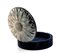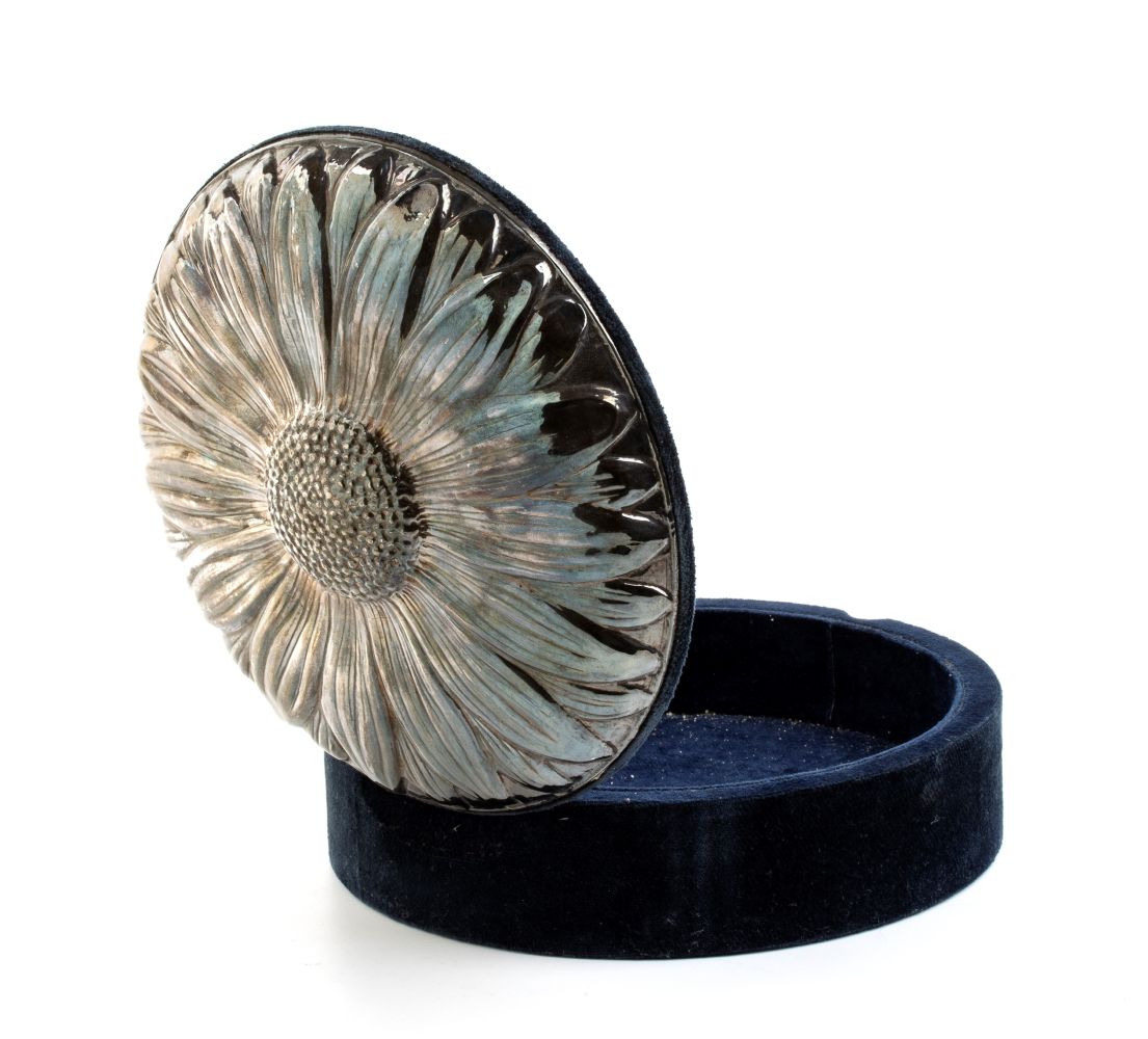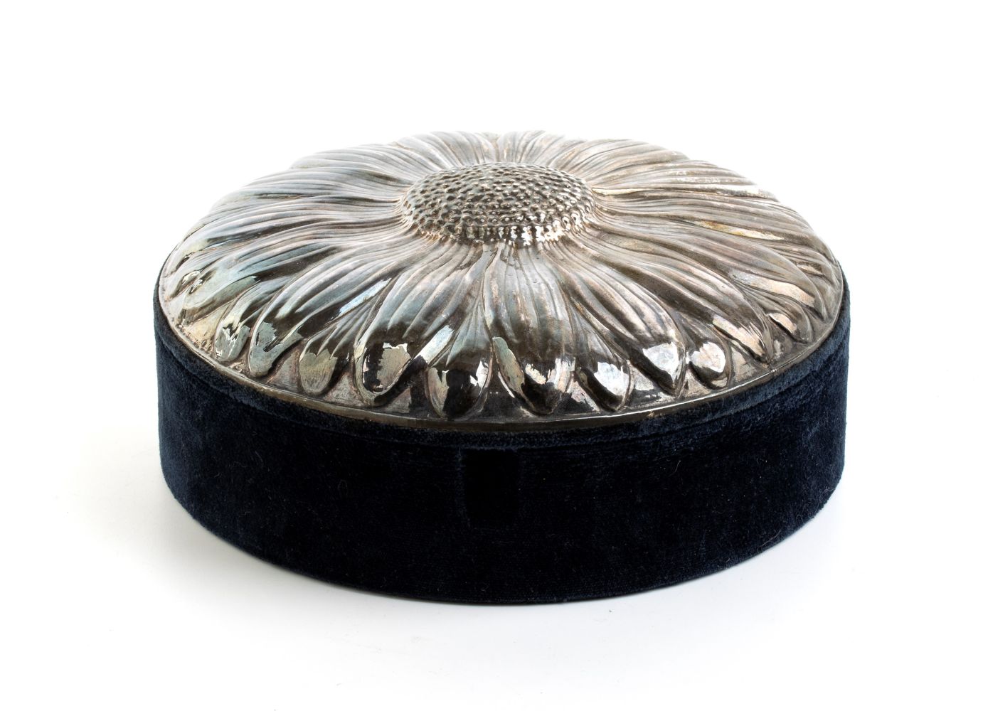 di forma circolare rivestita di velluto blu con inserto in argento 925/1000 a forma di fiore. Punzonata "925 - 889 - 70".