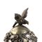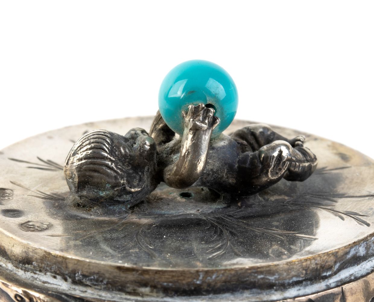 in argento fuso con coperchio ad innesto, decorato con festoni vegetali e cimato da un aquila, poggiante su un supporto a tripode con volute vegetali.