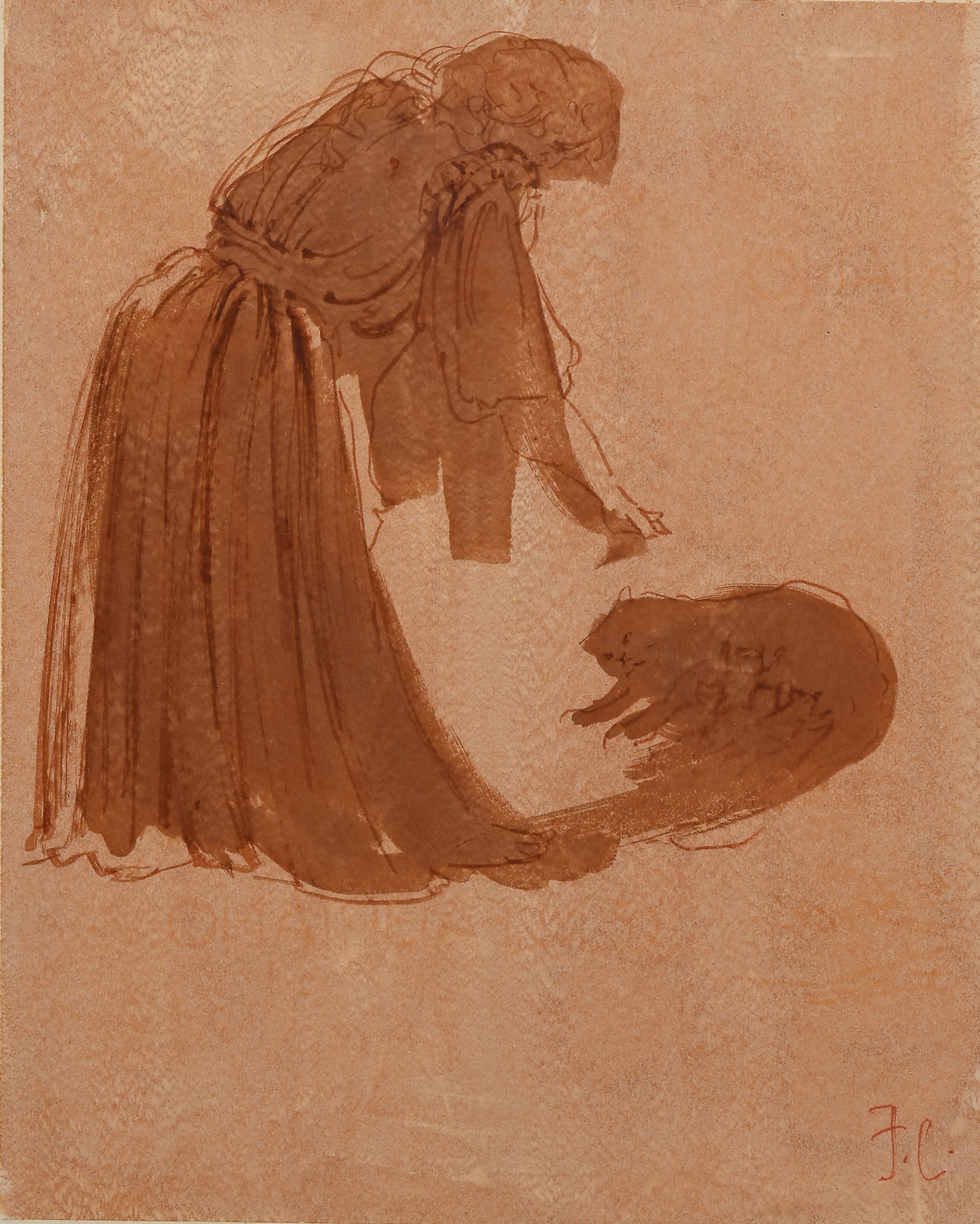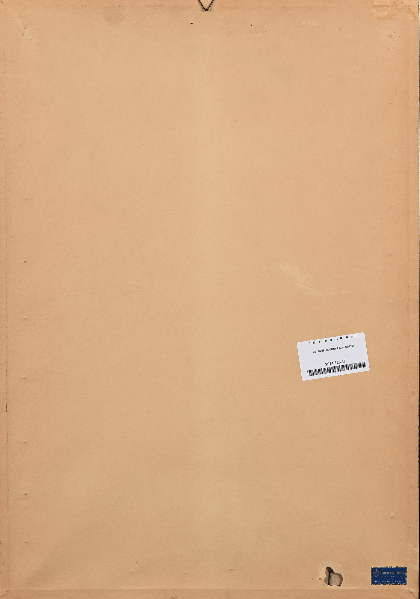 Fabrizio Clerici Milano 1913-Roma 1993 Donna con gatto 1965 Pennarello, china e acquarello su carta Monogramma "F.C". Dedica, firma e data "A Gianna Manzini, questi pochi segni e il molto affetto del tuo Fabrizio Clerici, Roma, 1.12.65". In basso a sinistra data "11 Giugno '65" cm 47x32 - in cornice cm 49x35