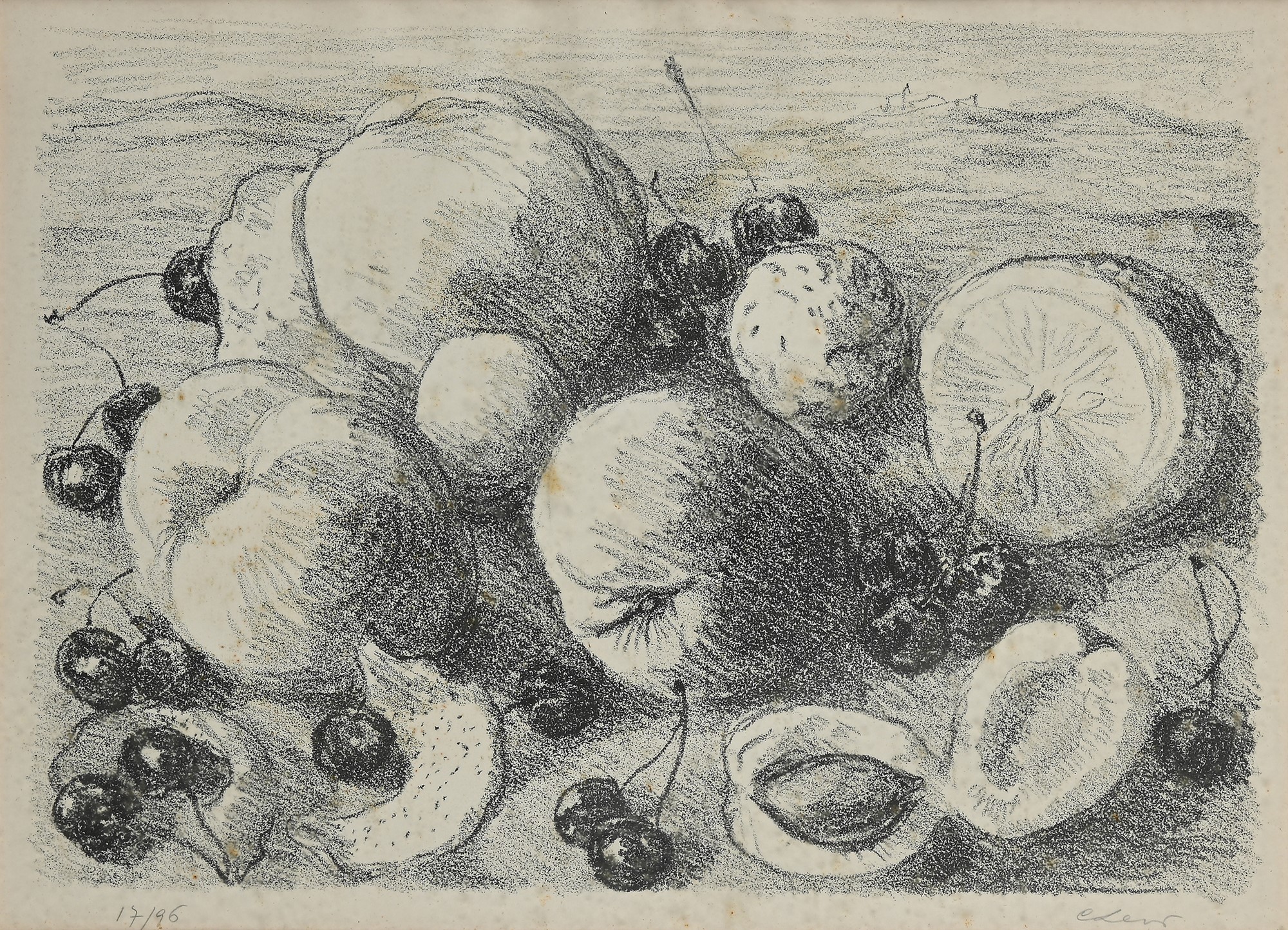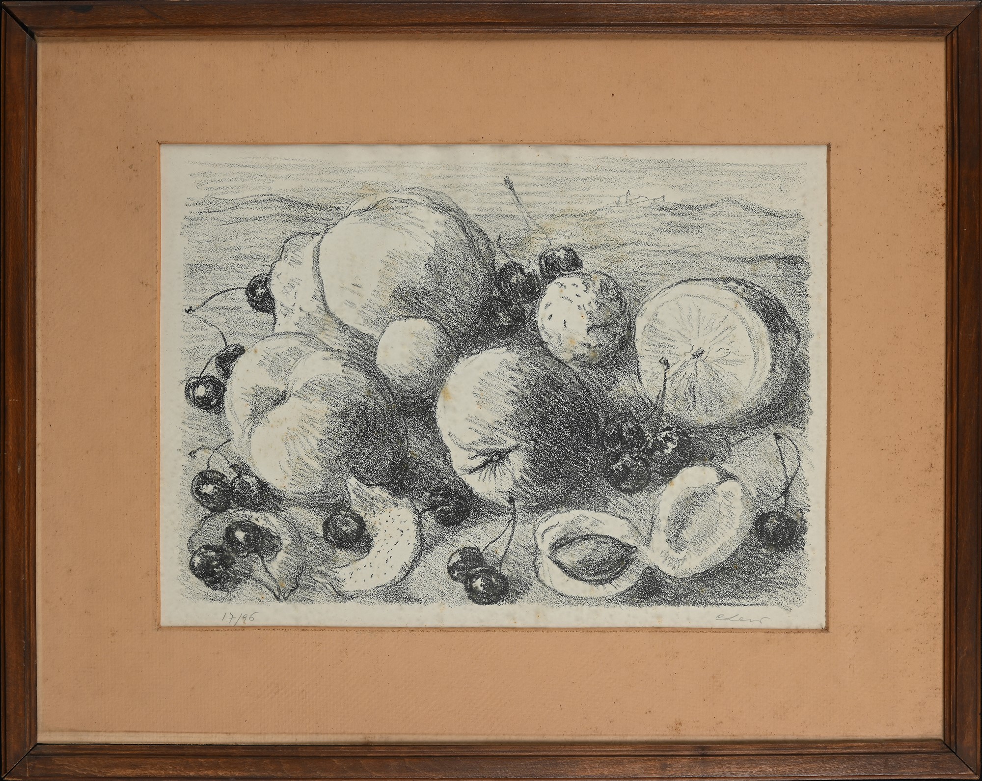 Carlo Levi Torino 1902-Roma 1975 Natura morta con ciliege, albicocche e limoni Litografia Firma e numerazione "C.Levi 17/96". cm 26x36 - in cornice cm 42x53