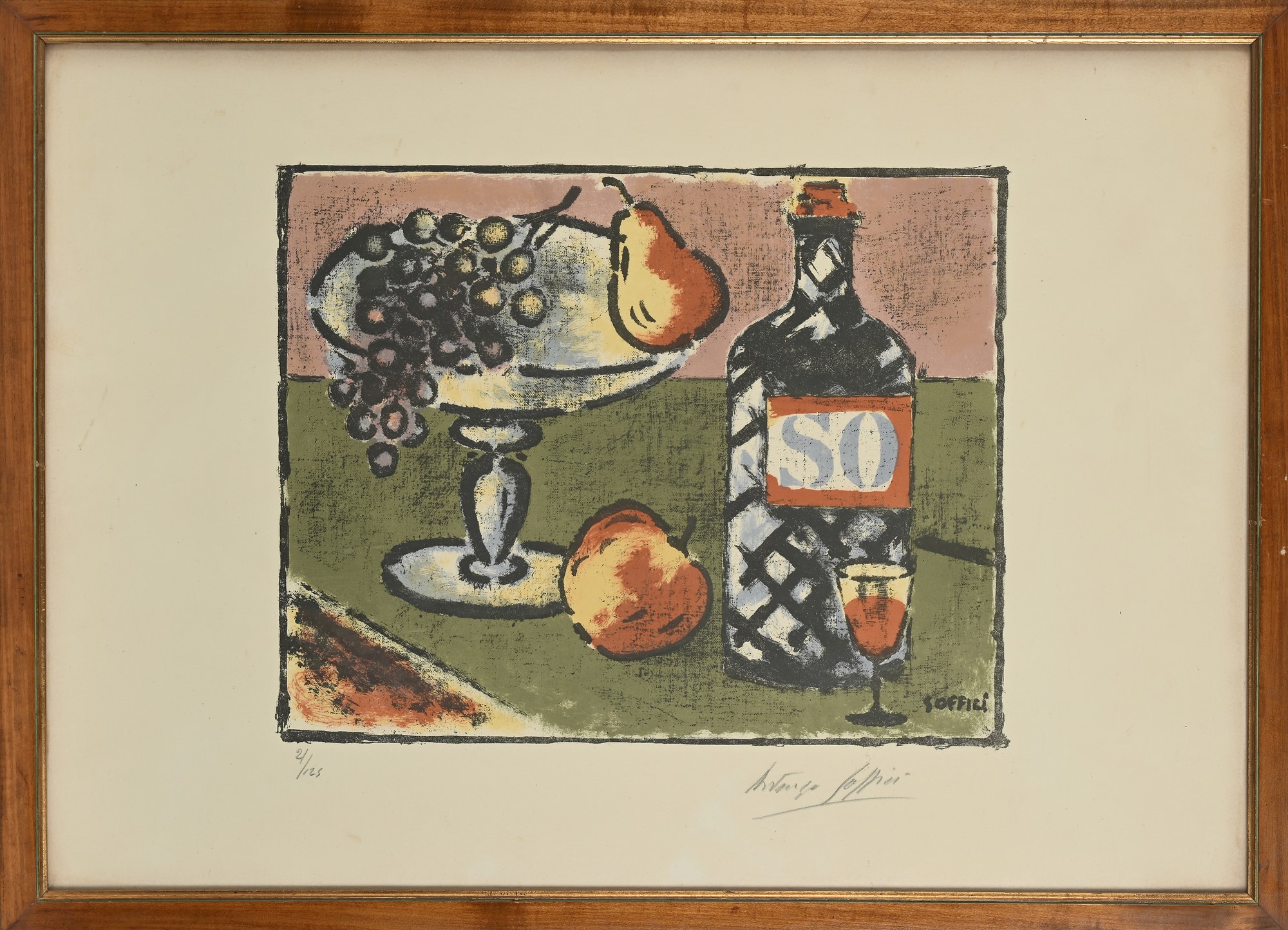 Ardengo Soffici Rignano sull'Arno 1879-Forte dei Marmi 1964 Natura morta con coppa di frutta Litografia a colori Firma e numerazione "Ardengo Soffici 21/125" cm 45x65 - con cornice cm 50x69