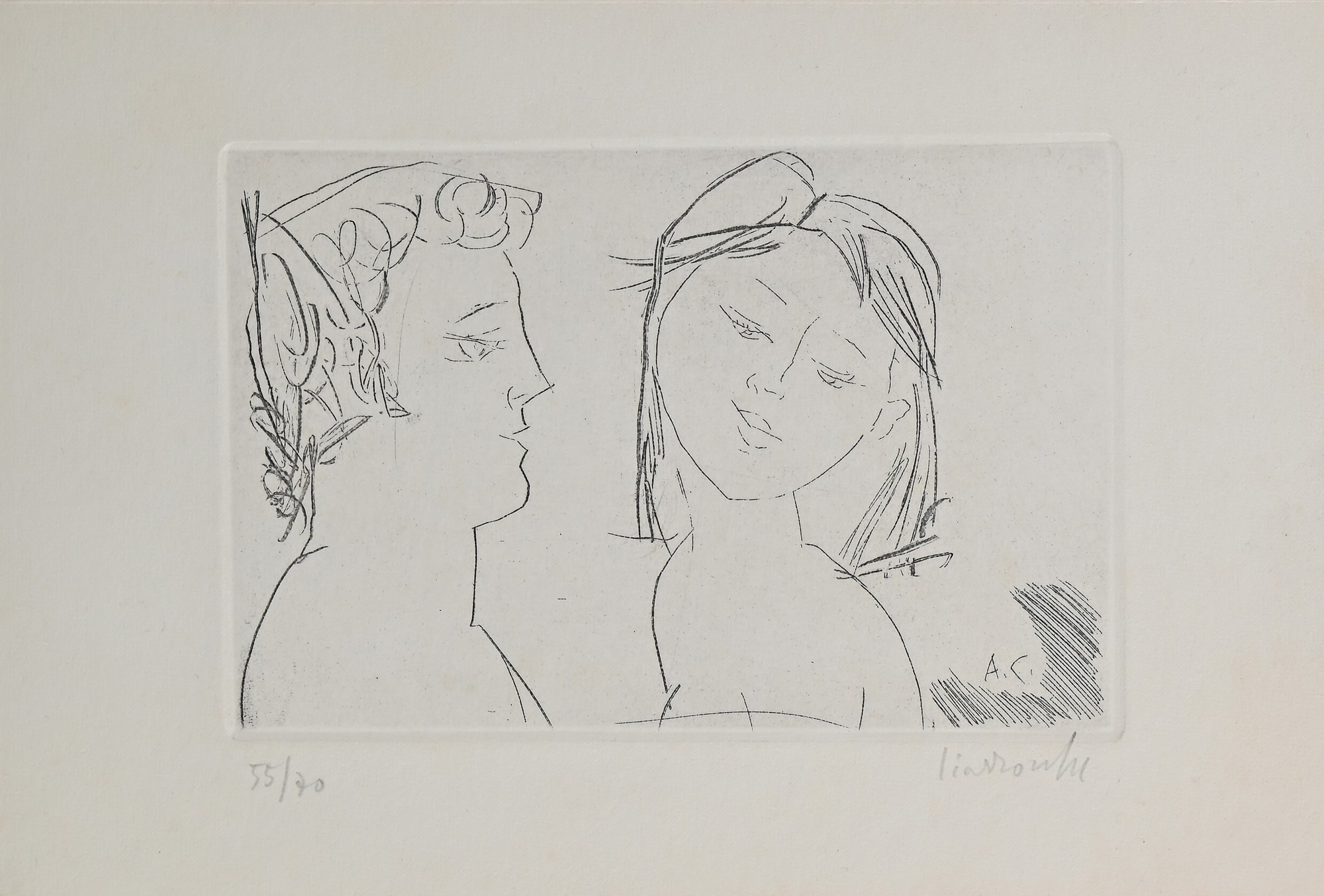 Arnoldo Ciarrocchi Civitanova Marche 1916-Civitanova Marche 2004 Due figure Acquaforte Firma e numerazione "Ciarrocchi 55/70".  cm 15x21,5