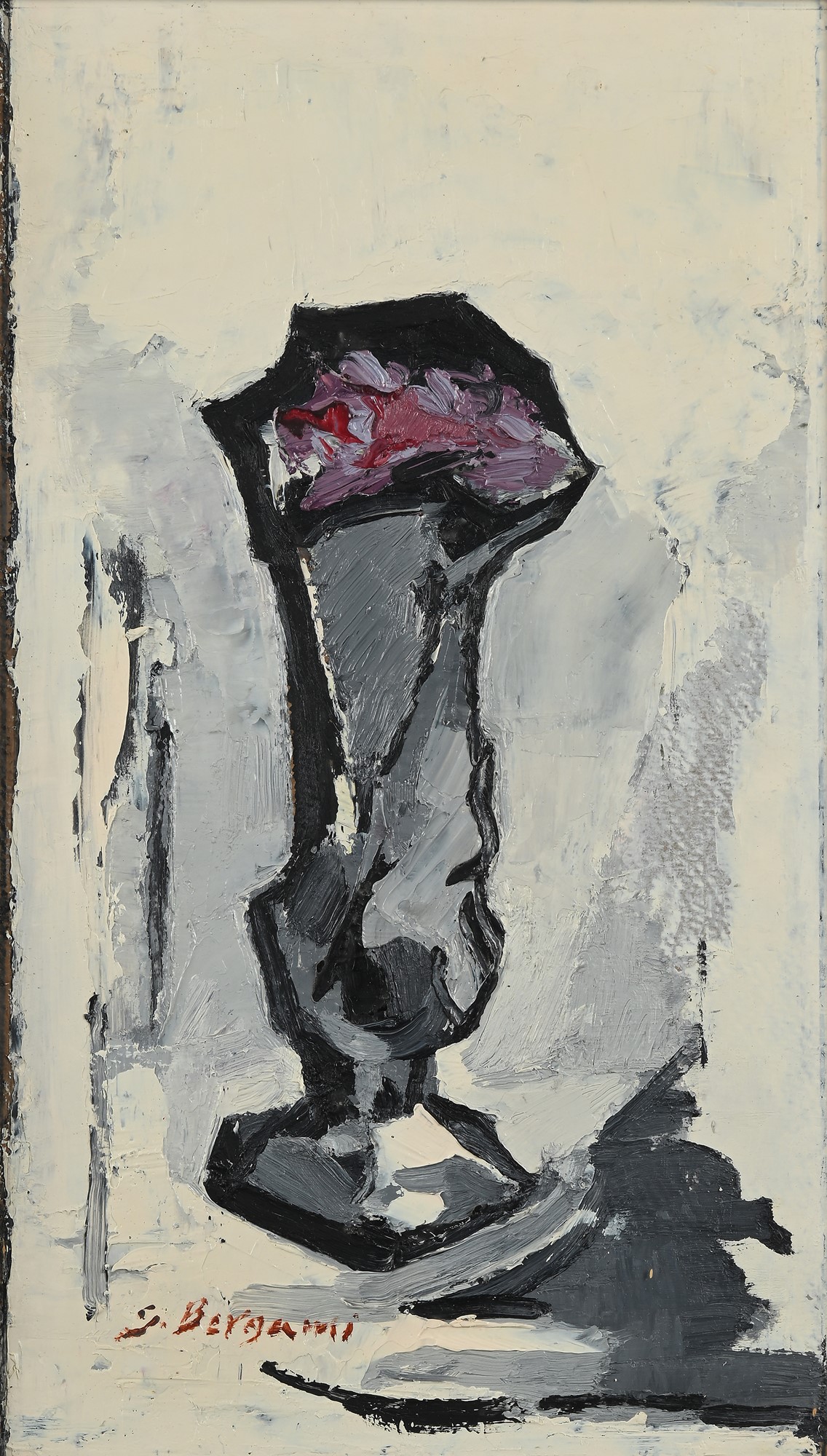 Giuliana Bergami Roma 1928-Imola 2005 Vaso di fiori 1972 Olio su cartone Firma in basso a sinistra "G. Bergami". Al verso dedica a Gianna Manzini e Enrico Falqui e data "1972". cm 38x21,5 - con cornice cm 42,5x27