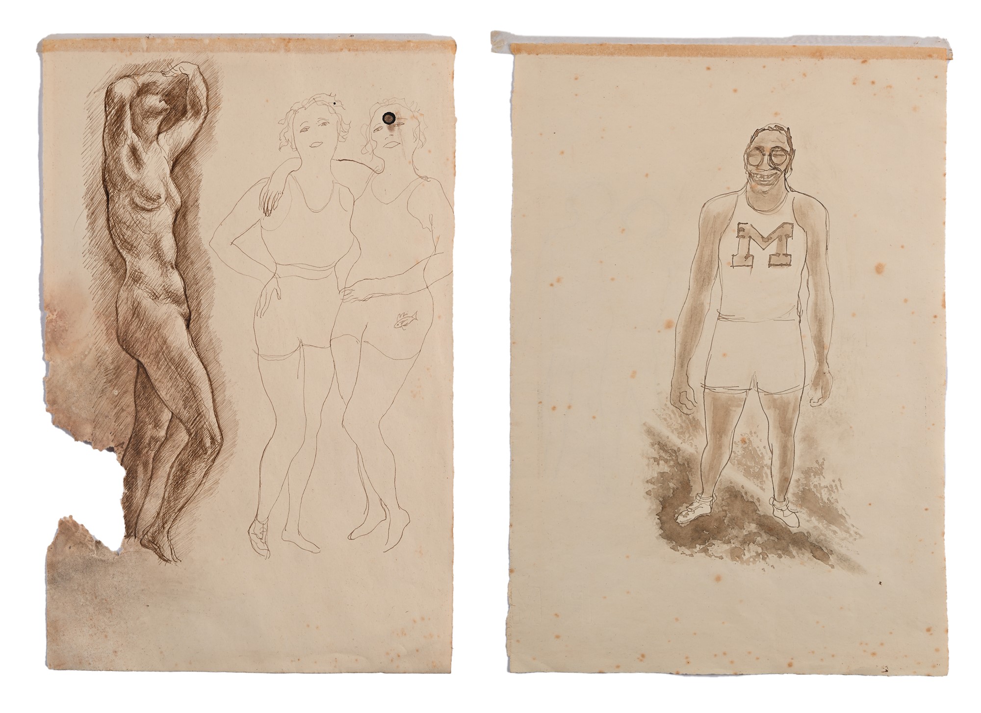 Anonimo del XX secolo Lotto di due disegni 1- Atleta, china e acquarello su...