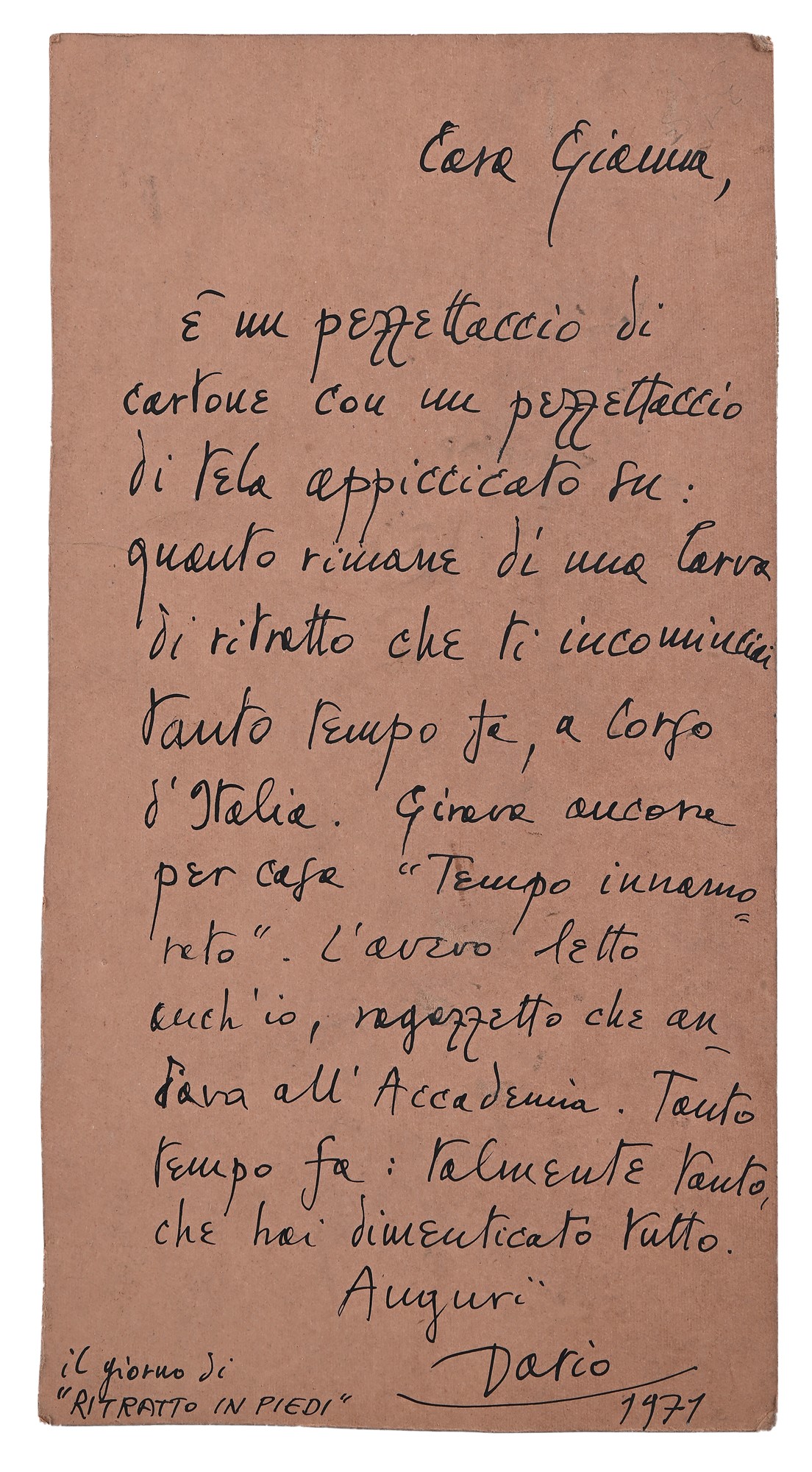 2- Ritratto di Gianna Manzini, 1971, olio su tela applicata su cartone, cm 32,5x17. Al verso reca dedica a Gianna Manzini, firma e data 'Dario 1971, il giorno di "Ritratto in Piedi" '.