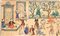 Miniatura con figure di orientali dipinte in policromia, Iran, dinastia Qajar, XIX secolo minuta rappresentazione di una scena di vita in un palazzo, animata da quattordici figure ritratte in diverse azioni