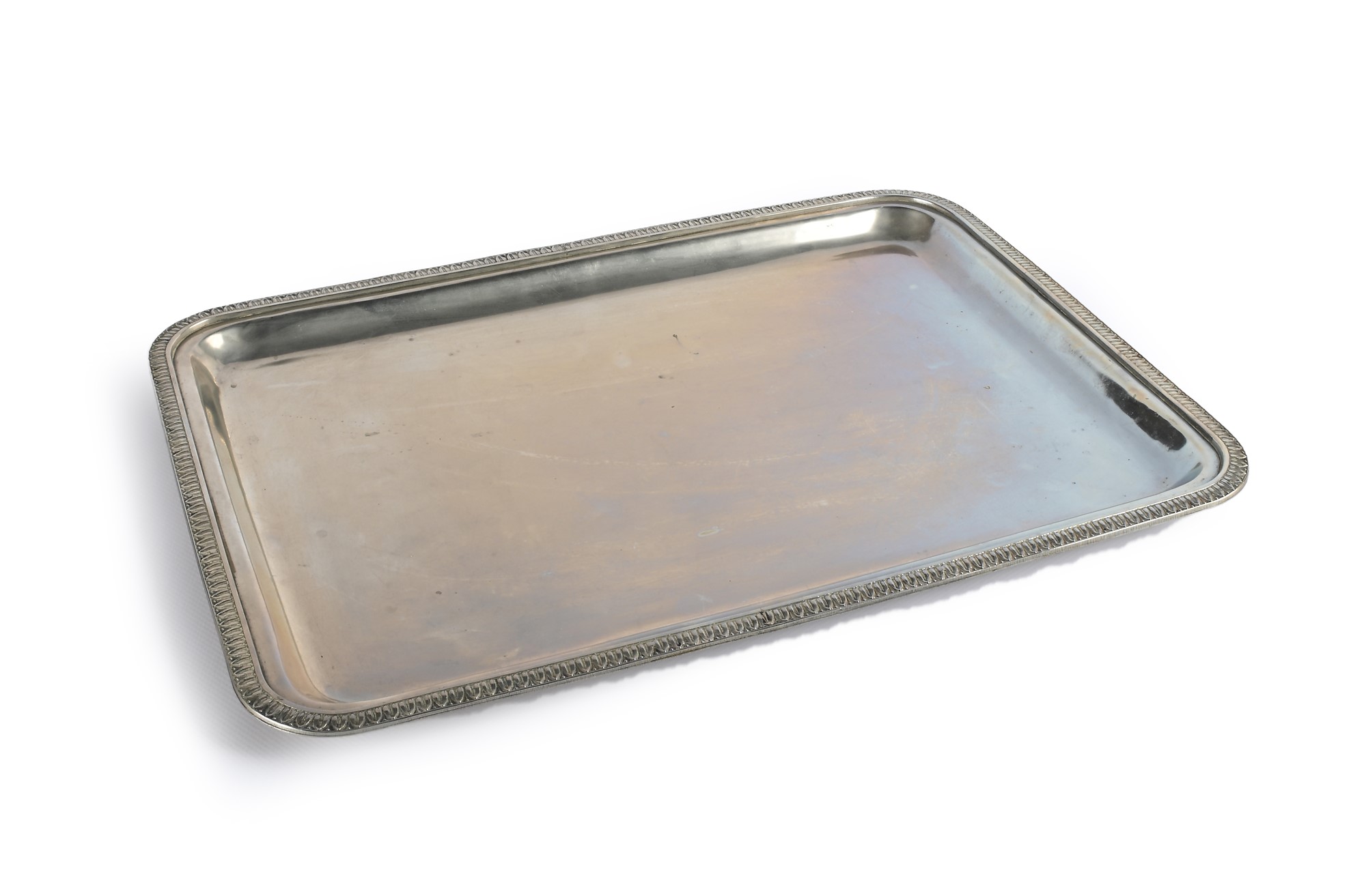 Vassoio rettangolare in alpacca, Fornari angoli arrotondati e profilo a palmette cm 45,5x34