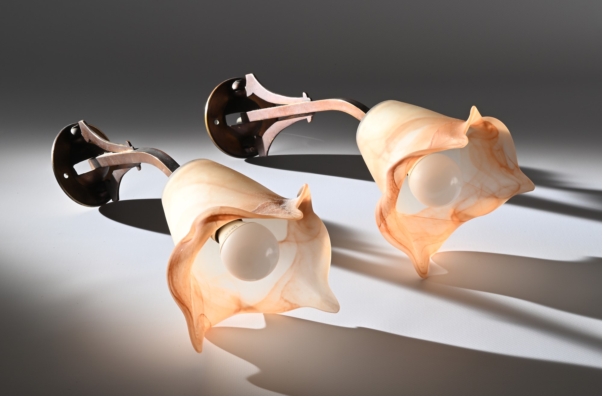 Coppia di appliques in ottone, inizi Novecento con braccetto mobile e campanula in vetro rosa/arancio cm 38 ca.