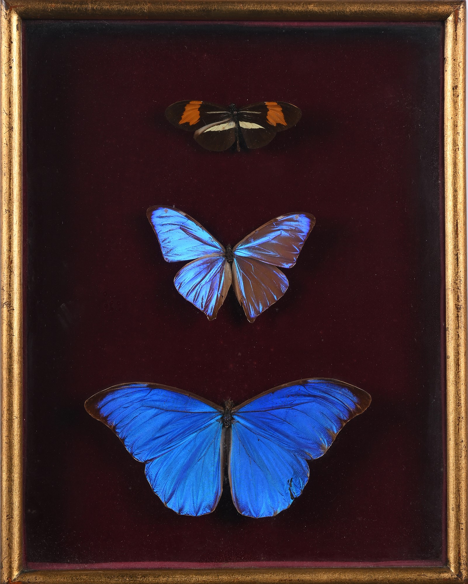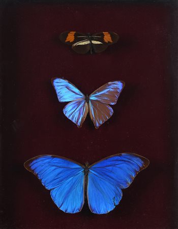 Tre farfalle diverse imbalsamate, entro teca cm 32x25,5 (cornice)