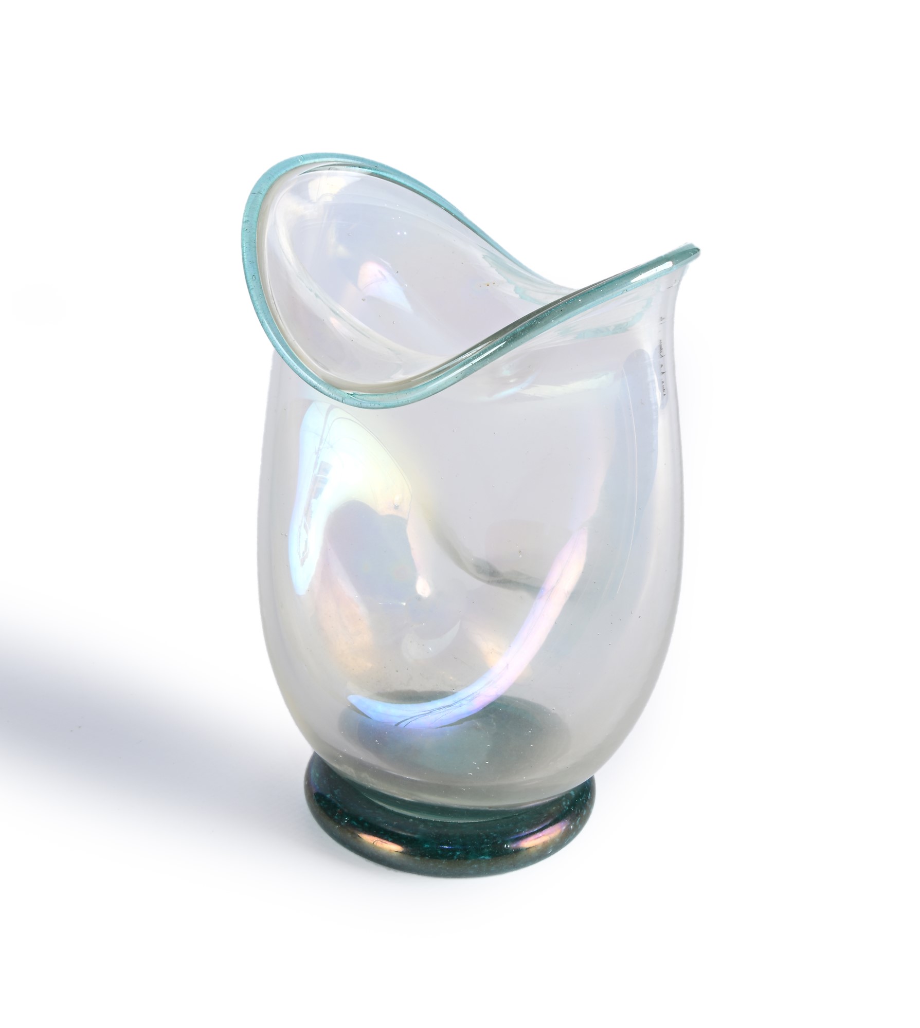 Vaso in vetro soffiato incolore iridato di forma schiacciata al centro su basso piede circolare verde altezza cm 16