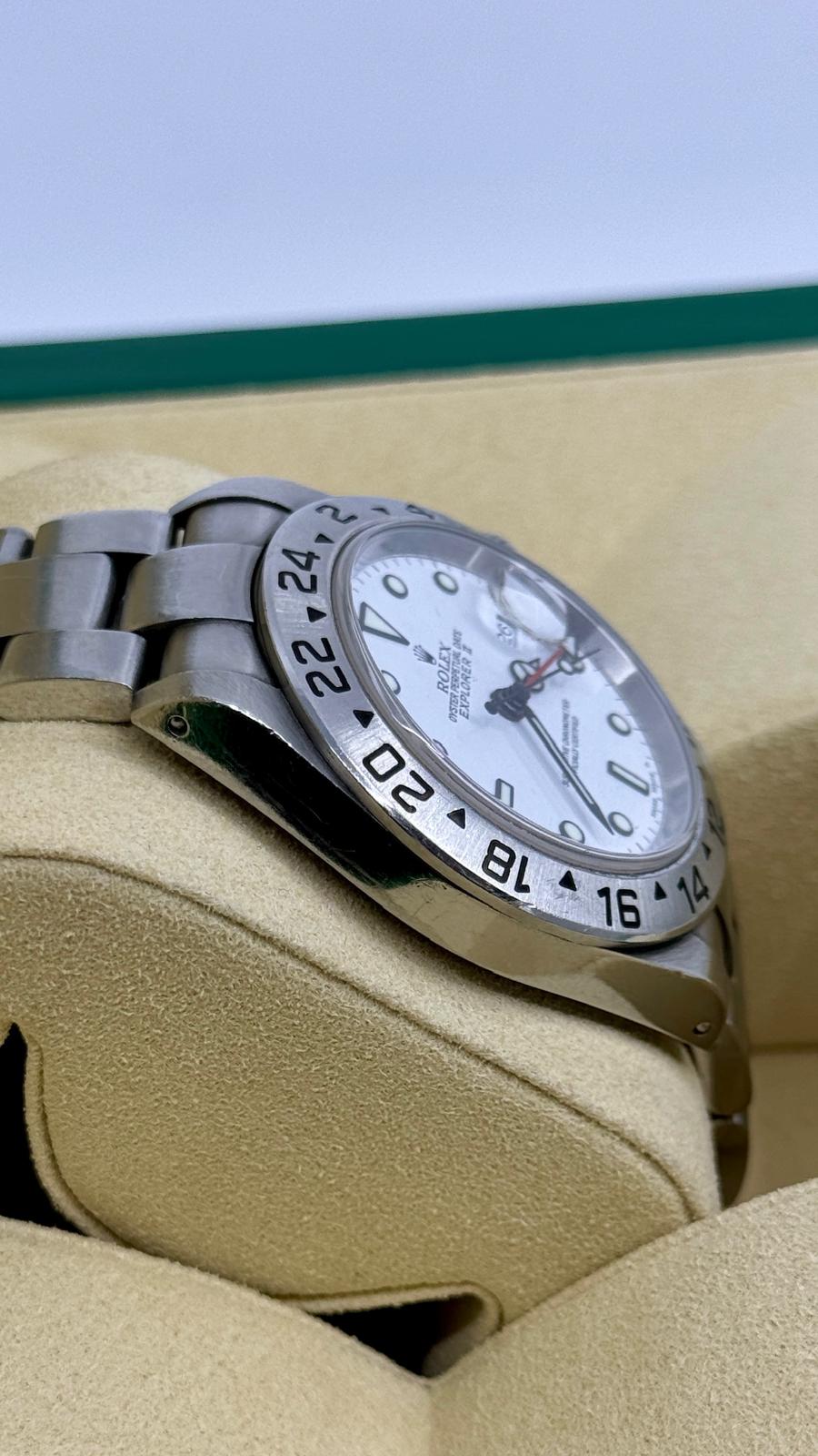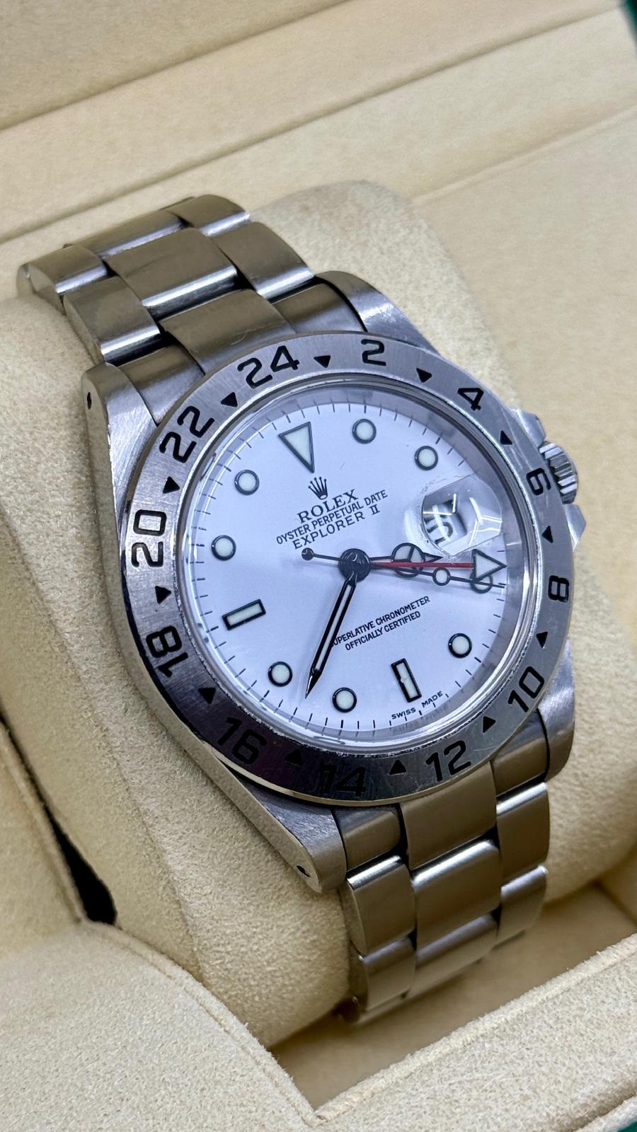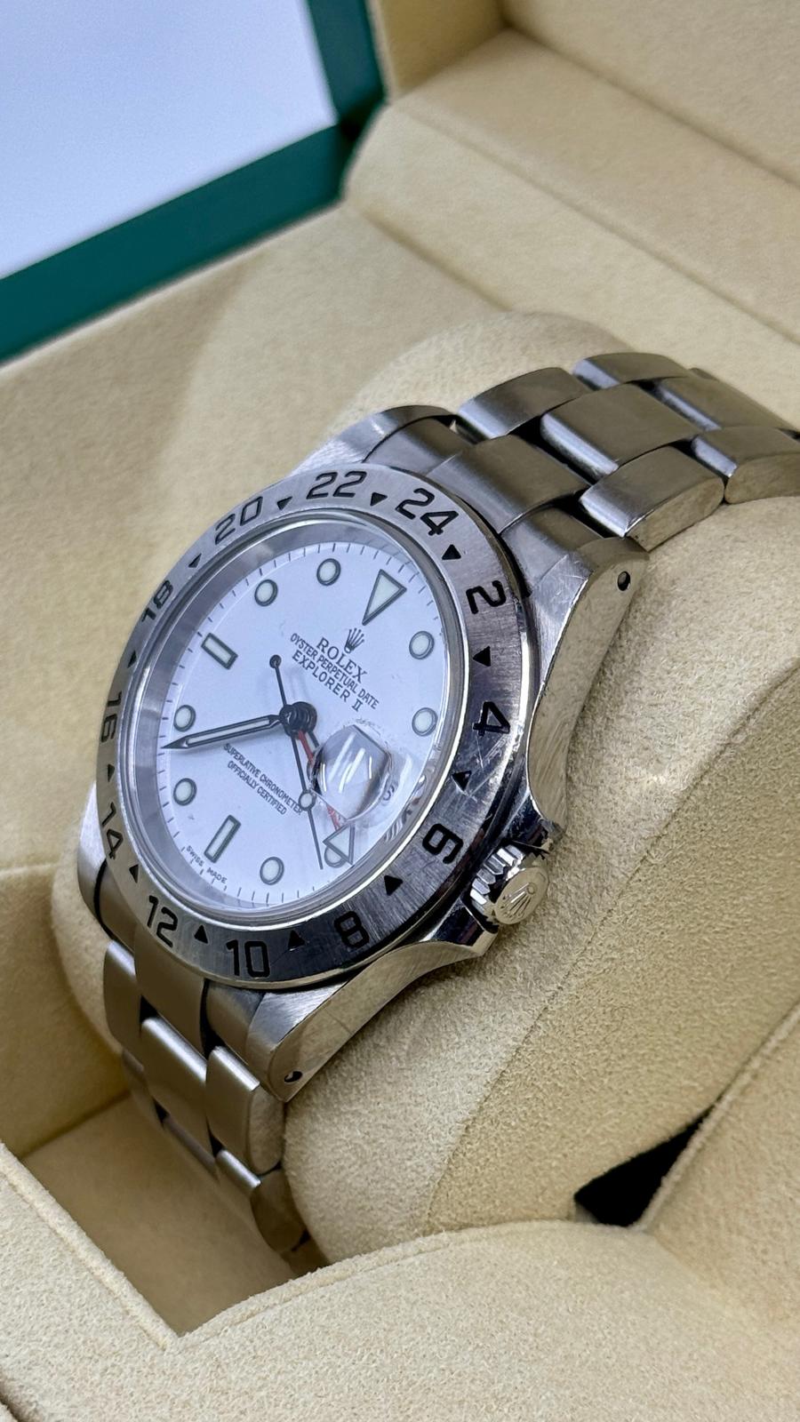 Marca Rolex Modello (Orologio) Explorer II Numero di referenza 16570 Carica Automatico Materiale della cassa Acciaio Materiale cinturino Acciaio Anno di produzione 2003 Corredo documenti originali, no box Materiale della cassa Acciaio Diametro 40 mm Impermeabile 10 ATM Materiale lunetta Acciaio Vetro zaffiro Quadrante bianco Numeri sul quadrante Senza numeri Cinturino Materiale cinturino Acciaio Colore cinturino Acciaio Chiusura Déployante Materiale chiusura Acciaio, orologio mai lucidato