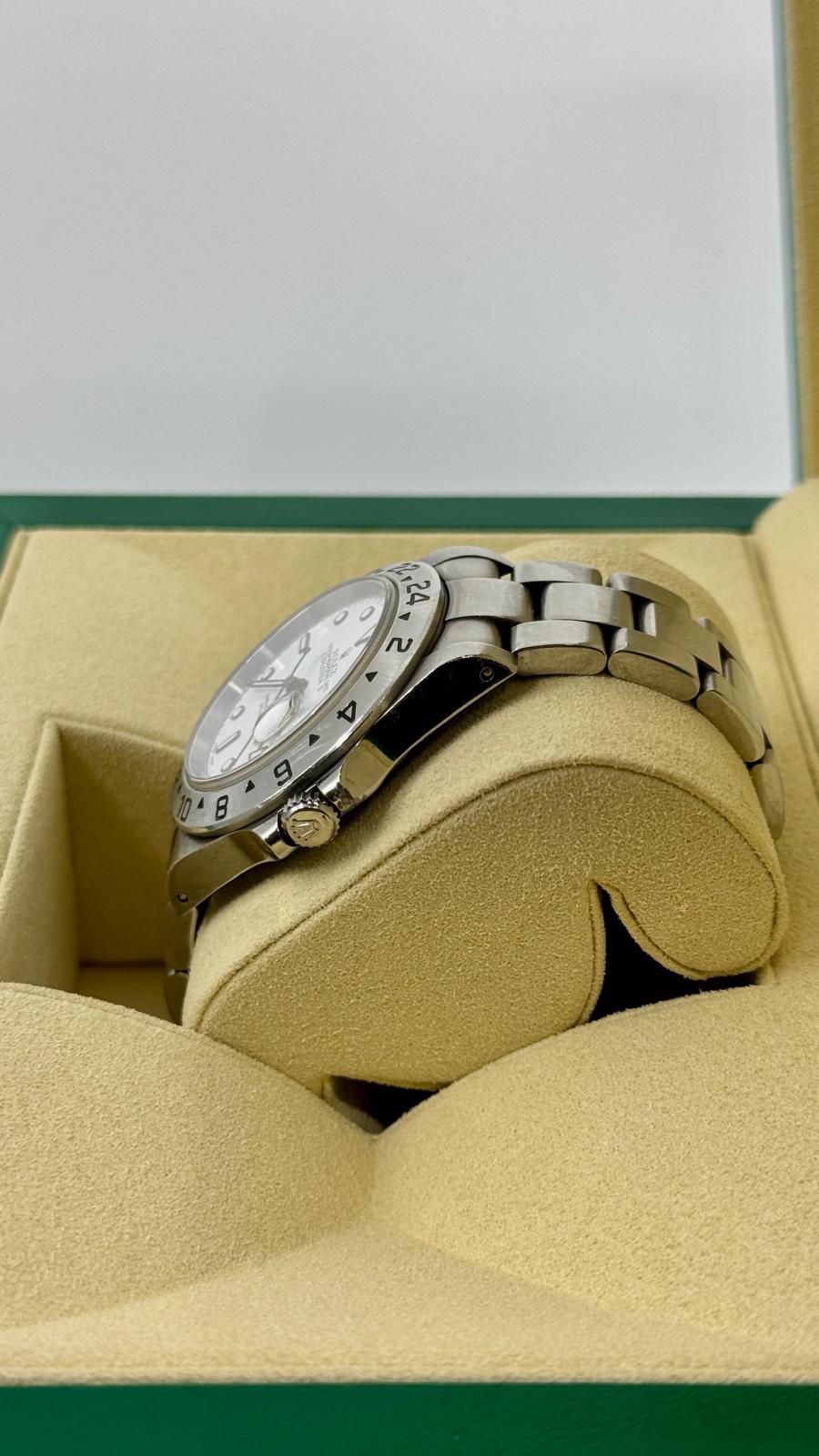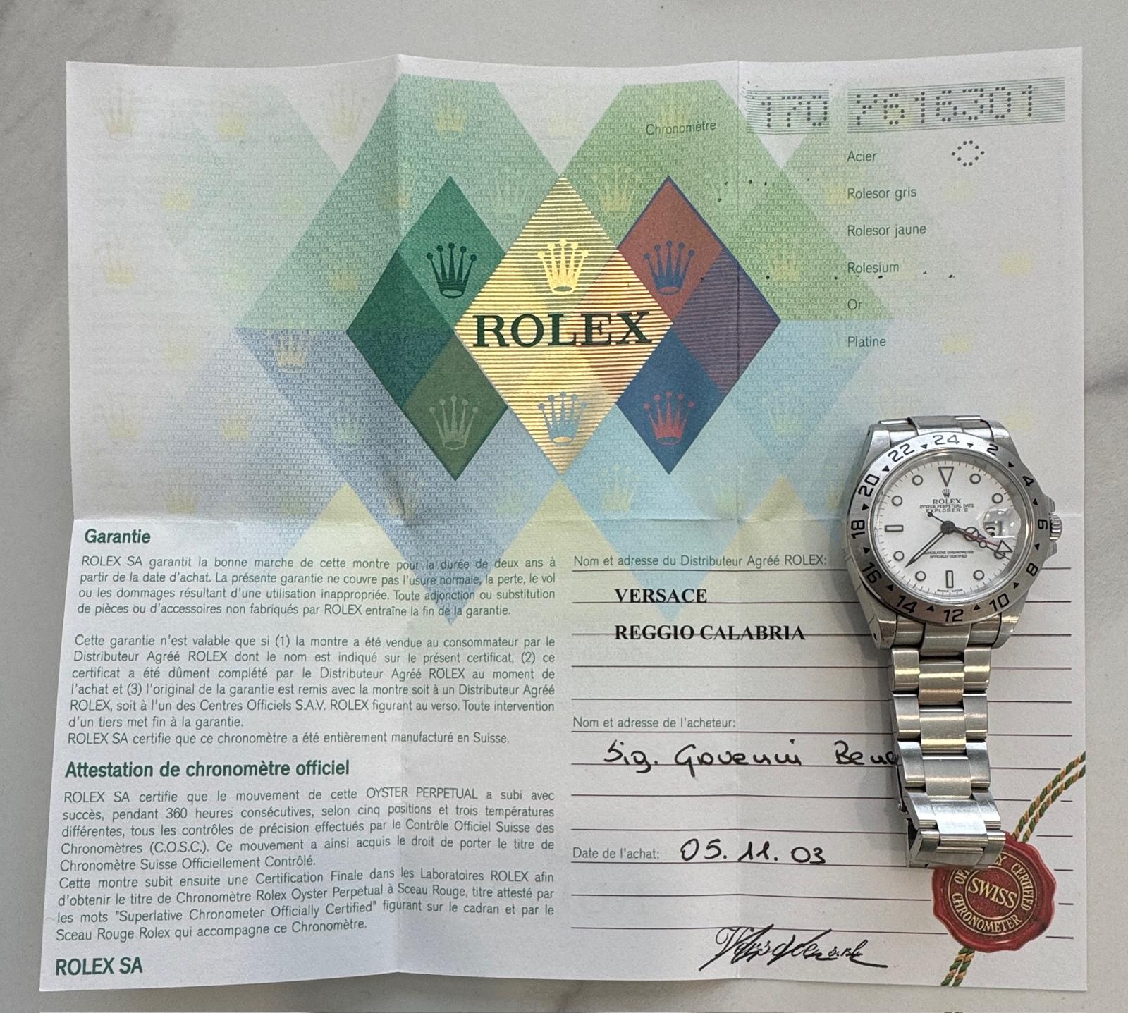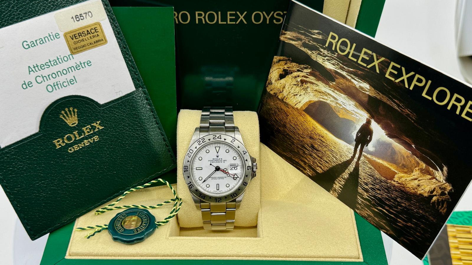 Marca Rolex Modello (Orologio) Explorer II Numero di referenza 16570 Carica Automatico Materiale della cassa Acciaio Materiale cinturino Acciaio Anno di produzione 2003 Corredo documenti originali, no box Materiale della cassa Acciaio Diametro 40 mm Impermeabile 10 ATM Materiale lunetta Acciaio Vetro zaffiro Quadrante bianco Numeri sul quadrante Senza numeri Cinturino Materiale cinturino Acciaio Colore cinturino Acciaio Chiusura Déployante Materiale chiusura Acciaio, orologio mai lucidato