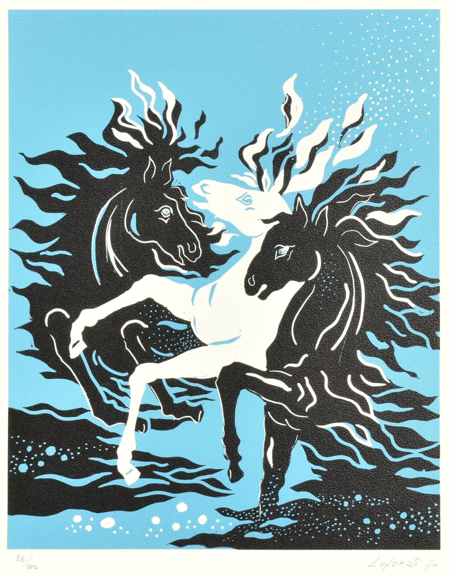 Leporati CAVALLI incisione su carta, cm 33,5x26; es. 83/100 firma e data...