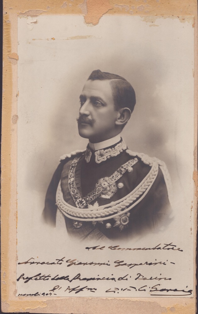 29x18 cm Foto con dedica e autografo di Emanuele Filiberto di Savoia all'avvocato Giovanni Gasperini, Prefetto della provincia di Torino. Napoli 1907. Buone condizioni della fotografia, lievi bruniture e strappi del passepartout.
