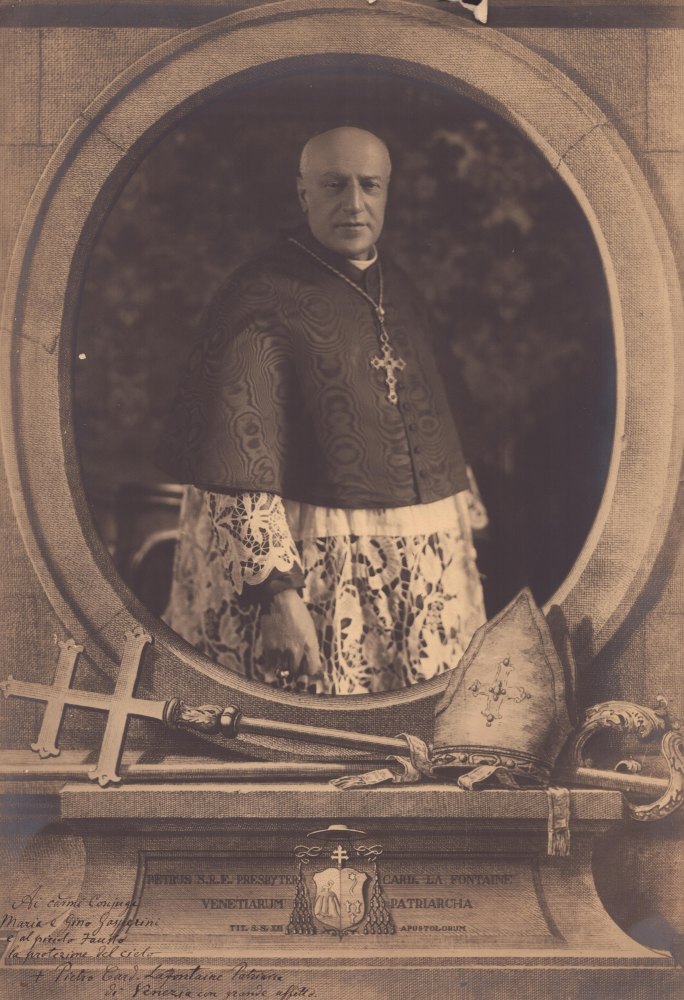 36 x 24,6 cm Fotografia autografata dal cardinale La Fontaine. La dedica riporta: "Ai carissimi coniugi Maria e Gino Gasperini e al piccolo Fausto la protezione del cielo. Pietro Card. Lafontaine Patriarca di Venezia con grande affetto". Lievi strappi della fotografia in alto a destra e alcune mancanze a sinistra.