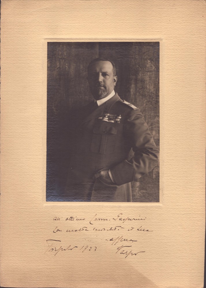 Fotografia autografata in Passepartout. La dedica riporta: "All'ottimo Com. Gasperini. Con molta cordialità il tuo. Tripoli 1923".