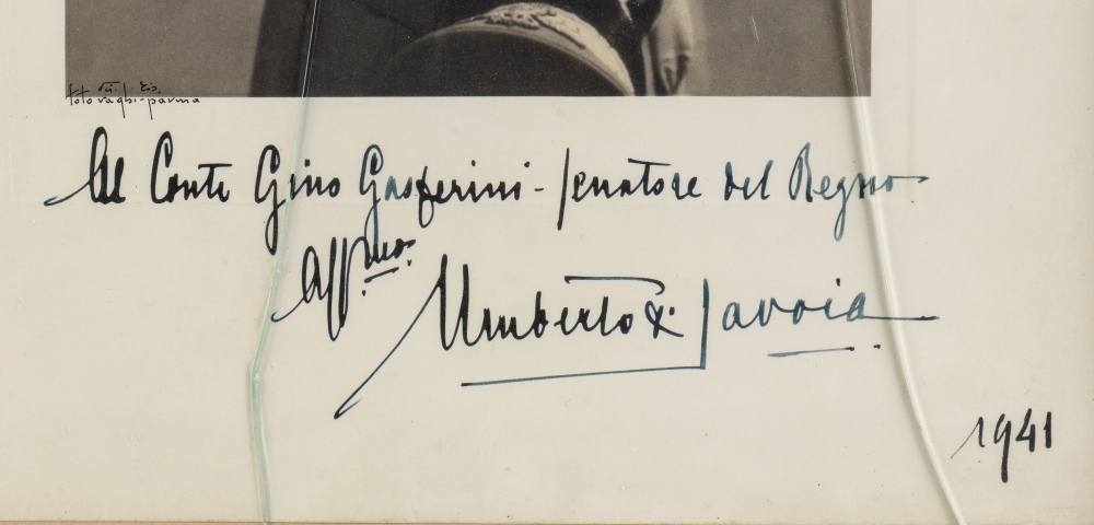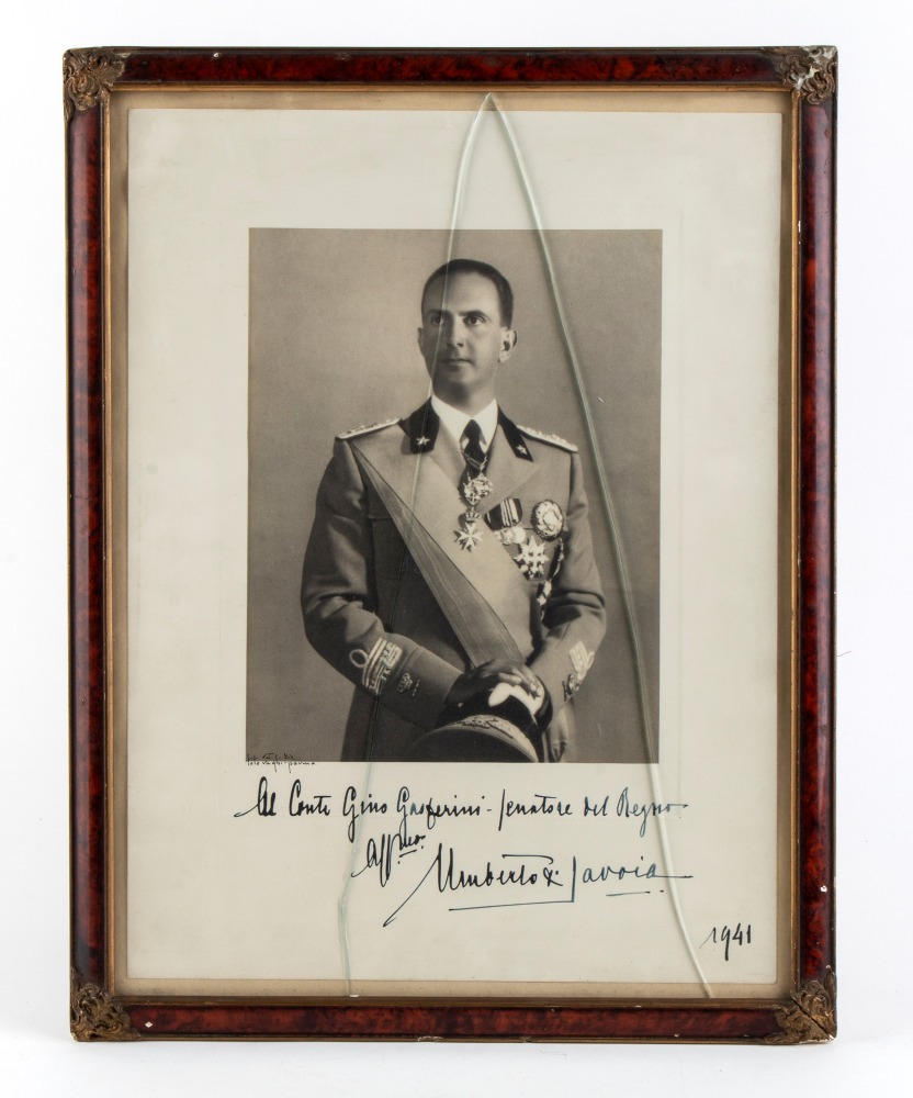 43 x 33 cm Fotografia incorniciata di Umberto di Savoia. La dedica riporta: " Al Conte Gino Gasperini senatore del Regno". La fotografia è in ottimo stato di conservazione mentre la cornice presenta il vetro rotto.