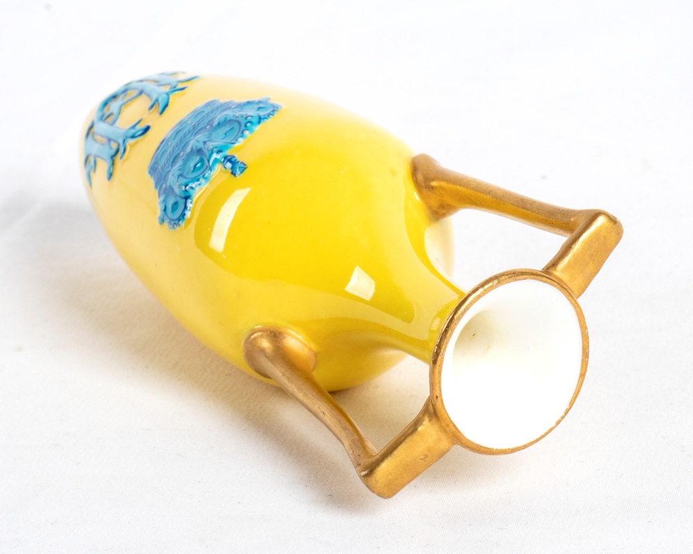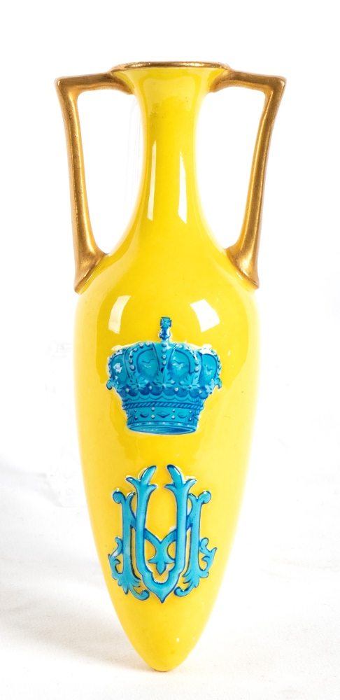 cm.14 Rara bomboniera celebrativa per le nozze reali di UMBERTO I di Savoia, Re d'Italia, e MARGHERITA, avvenute il 22 Aprile 1868. Realizzata in ceramica, dai bei colori giallo e blu, con profilature oro ed interno bianco. Originale del 1868, in perfette condizioni, misura cm.14
