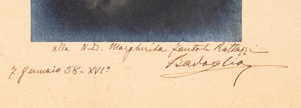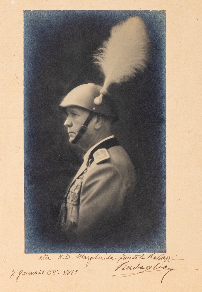 cm.24,5x30,5 Foto in b/n del Maresciallo d'Italia Pietro Badoglio, in Grande Uniforme, con elmetto modello 31 con aigrette. Dedica ad una nobildonna e firma autografe in calce alla foto, vergate sul cartoncino di supporto, datata 7 Gennaio 1938 - XVI° - Misure della foto cm.12,7x21,8 in ottimo stato