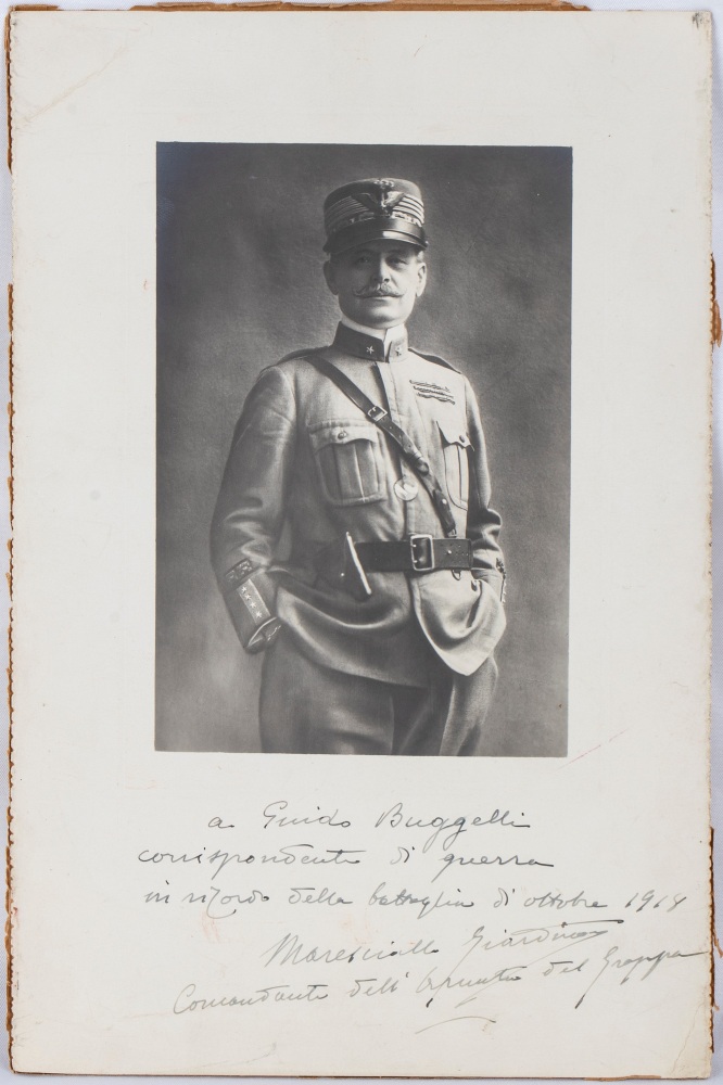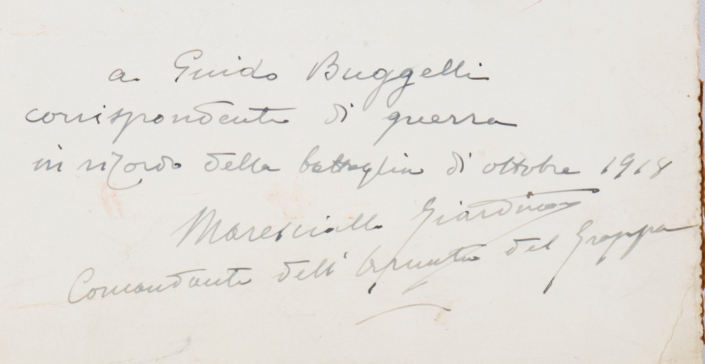 La dedica recita "a Guido Buggelli corrispondente di guerra in ricordo della battaglia d'Ottobre 1919 - Maresciallo Giardino - Comandante dell'Armata del Grappa"