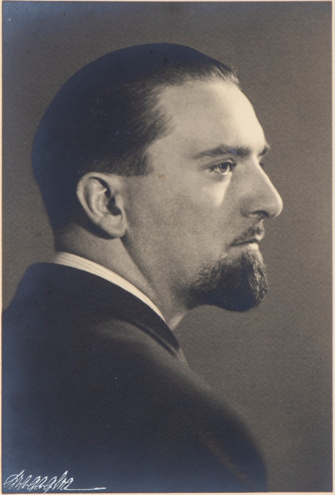 Foto b/n a mezzo busto tre quarti, di Dino Grandi con dedica e firma autografa originale, ad inchiostro nero, e data scritta sul lato destro 20/4/VII°