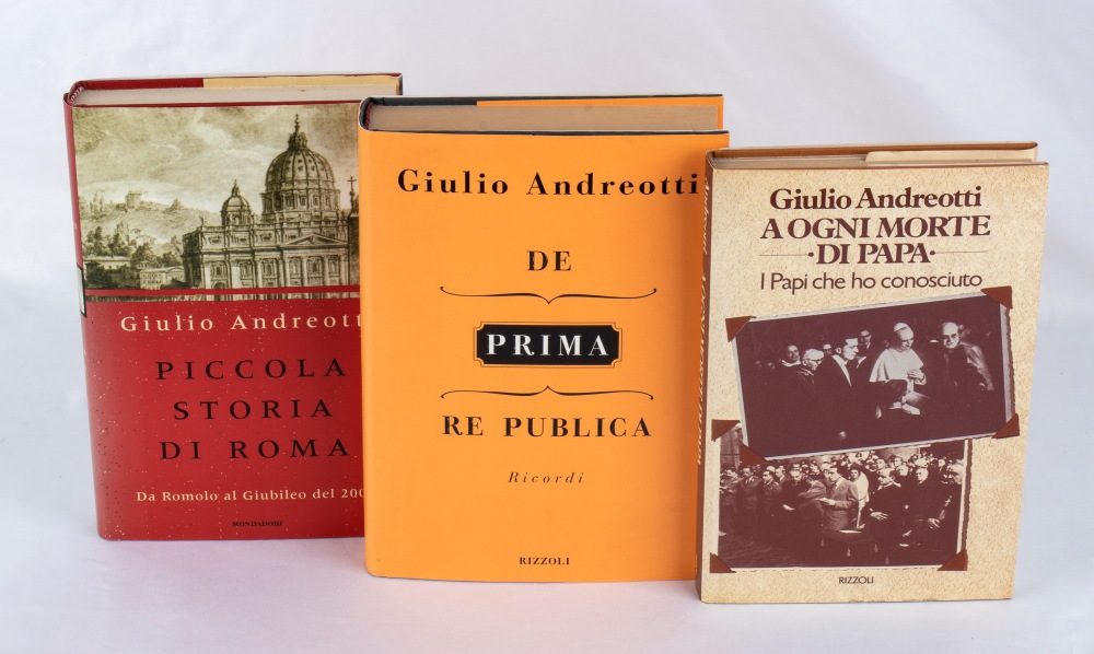 Lotto di tre volumi, ognuno con dedica e firma autografa di Giulio Andreotti, scritte di pugno.