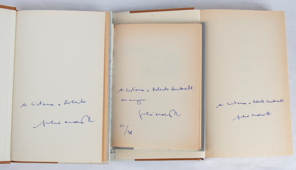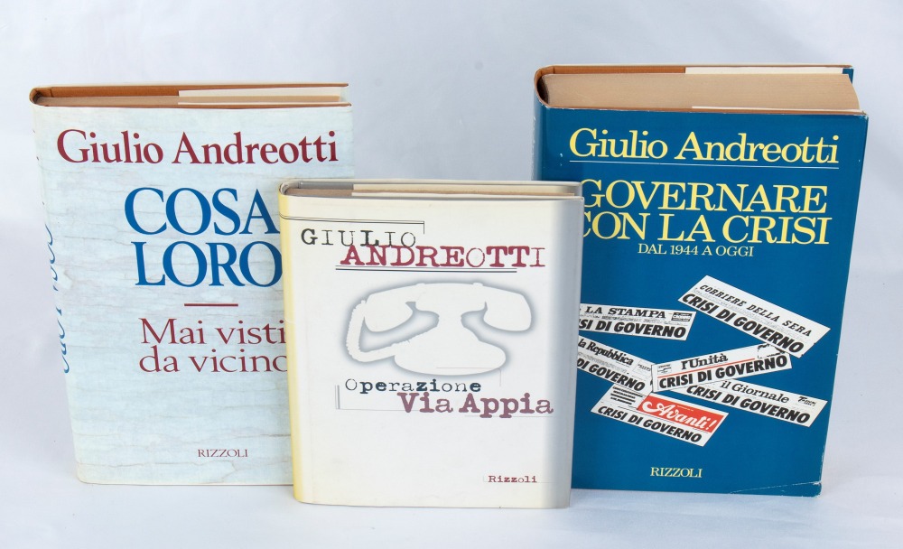 Lotto di tre volumi, ognuno con dedica e firma autografa di Giulio Andreotti, scritte di pugno.