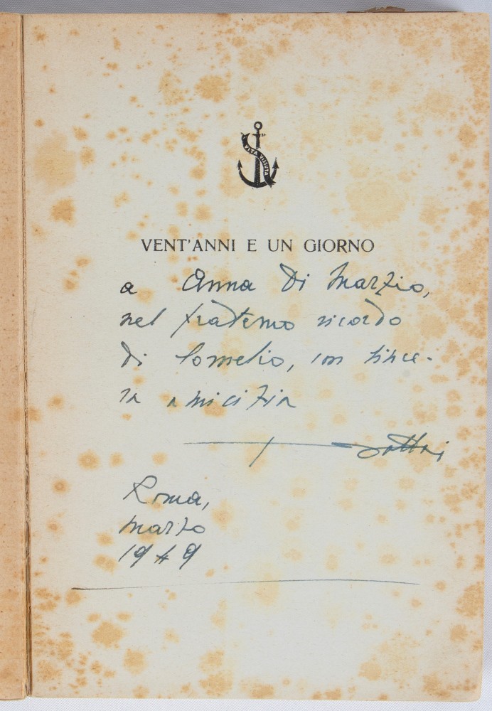 Dedica ed autografo originali di Giuseppe Bottai, al frontespizio del volume da lui scritto "Vent'anni e un giorno" , edito da Garzanti, prima edizione del 1949.