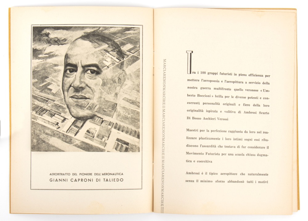 "A.G. Ambrosi aeropittore futurista nelle opere della «Raccolta Caproni» esaltato da F.T. Marinetti Sansepolcrista Accademico d’Italia" - 1941 - Gruppo futurista veronese «Umberto Boccioni» - Riproduzione dell’aeroritratto di Caproni su carta applicata a pagina [2], testo in cornice tipografica con il motivo «Marciare non marcire» - In 8°, punto metallico, brossura gialla stampata in verde ai piatti, pp. [16]
