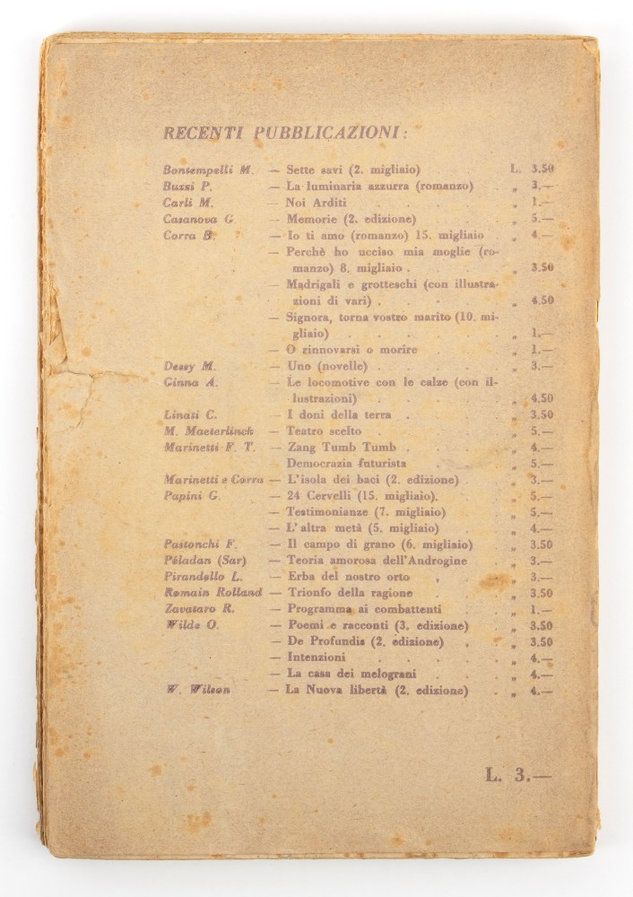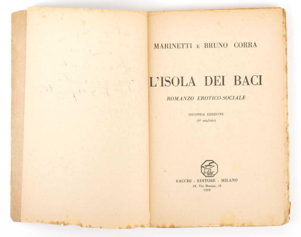 Romanzo erotico-sociale. In prima pagina muta troviamo la dedica con autografo originali di Filippo Tommaso Marinetti (Alessandria d'Egitto, 22 dicembre 1876 – Bellagio, 2 dicembre 1944) , scritta in inchiostro nero. L'isola dei baci è Capri. Volume in discrete condizioni, segni sparsi e usure al dorso, strappetto in ultima di copertina, usato con alcuni appunti a matita della poetessa futurista Zimei (amica intima di Marinetti) - In 16°, brossura stampata in color vinaccia ai piatti e al dorso (L. Venna), pp. 164 - 2' edizione 1919 - Facchi Editore Milano , misure cm.19x13