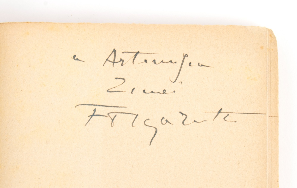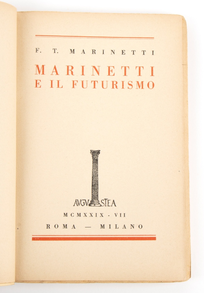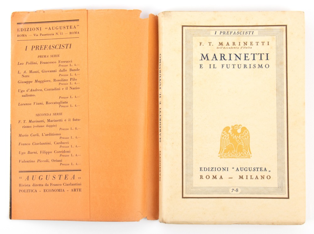 cm.19,5x13 "MARINETTI E IL FUTURISMO" collana "I prefascisti" edizioni AUGUSTEA - Di Filippo Tommaso Marinetti (Alessandria d'Egitto, 22 dicembre 1876 – Bellagio, 2 dicembre 1944), brossura, pp.174, rara prima edizione con rara sovracoperta arancione. All'interno dedica ed autografo originali di F.T.Marinetti alla sua amica poetessa Artemisia Zimei. In buone condizioni, appunti a matita della poetessa, piccolo ex-libris applicato alla sovracoperta, lievi segni d'uso strappi alla sovracoperta. Misure cm.19,5x13