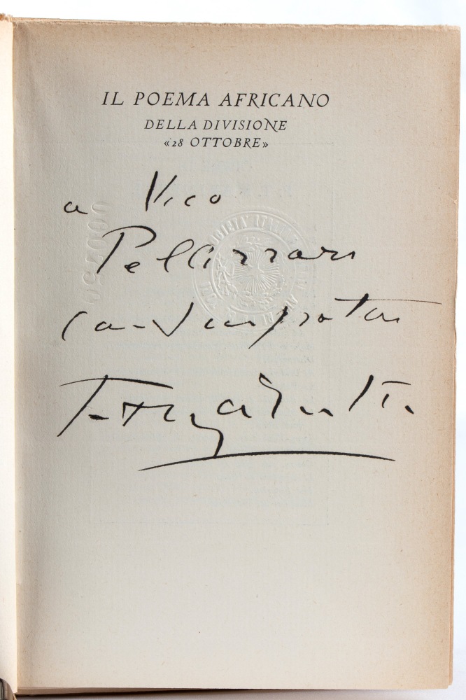 Dedica e firma autografe di Filippo Tommaso Marinetti sul volume "Il poema africano", scritti ad inchiostro nero, indirizzata al Vico Pellizzari senatore del Regno.