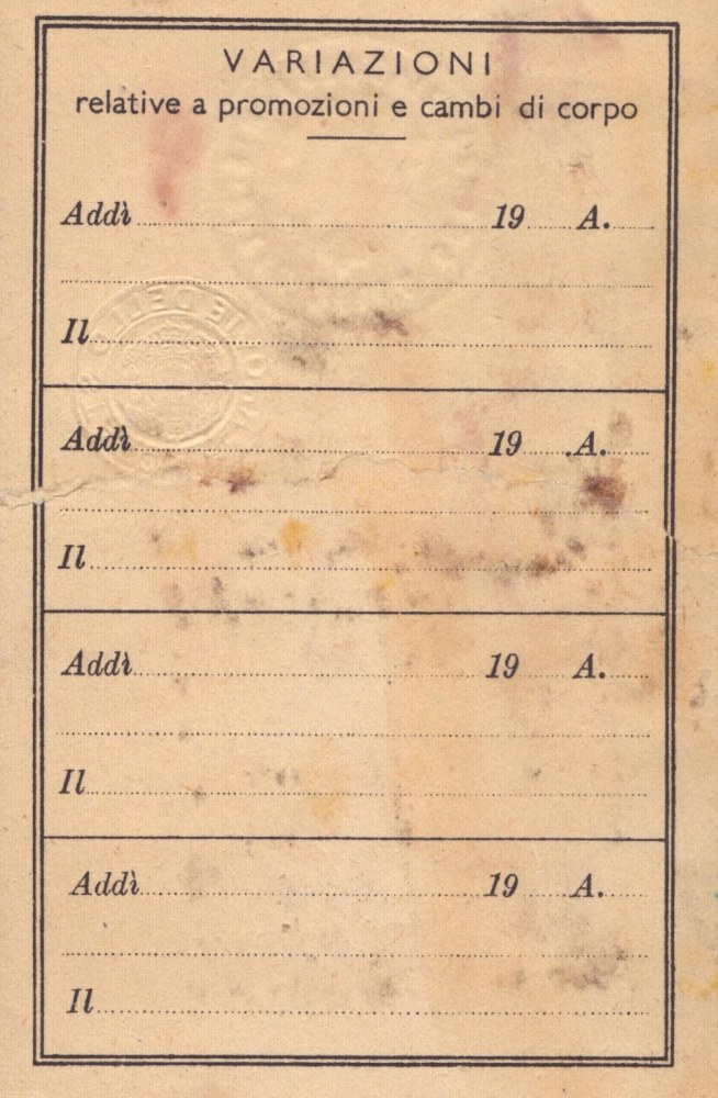 10x6,5cm Tessera Forze Armate dello Stato MINISTERO DELLA GUERRA , Bologna, per il Sottotenente Luciano Lama. Rilasciata a Cesena nel 1943. Strappo centrale, restaurata. Condizioni mediocri. Misure cm. 6,5x10