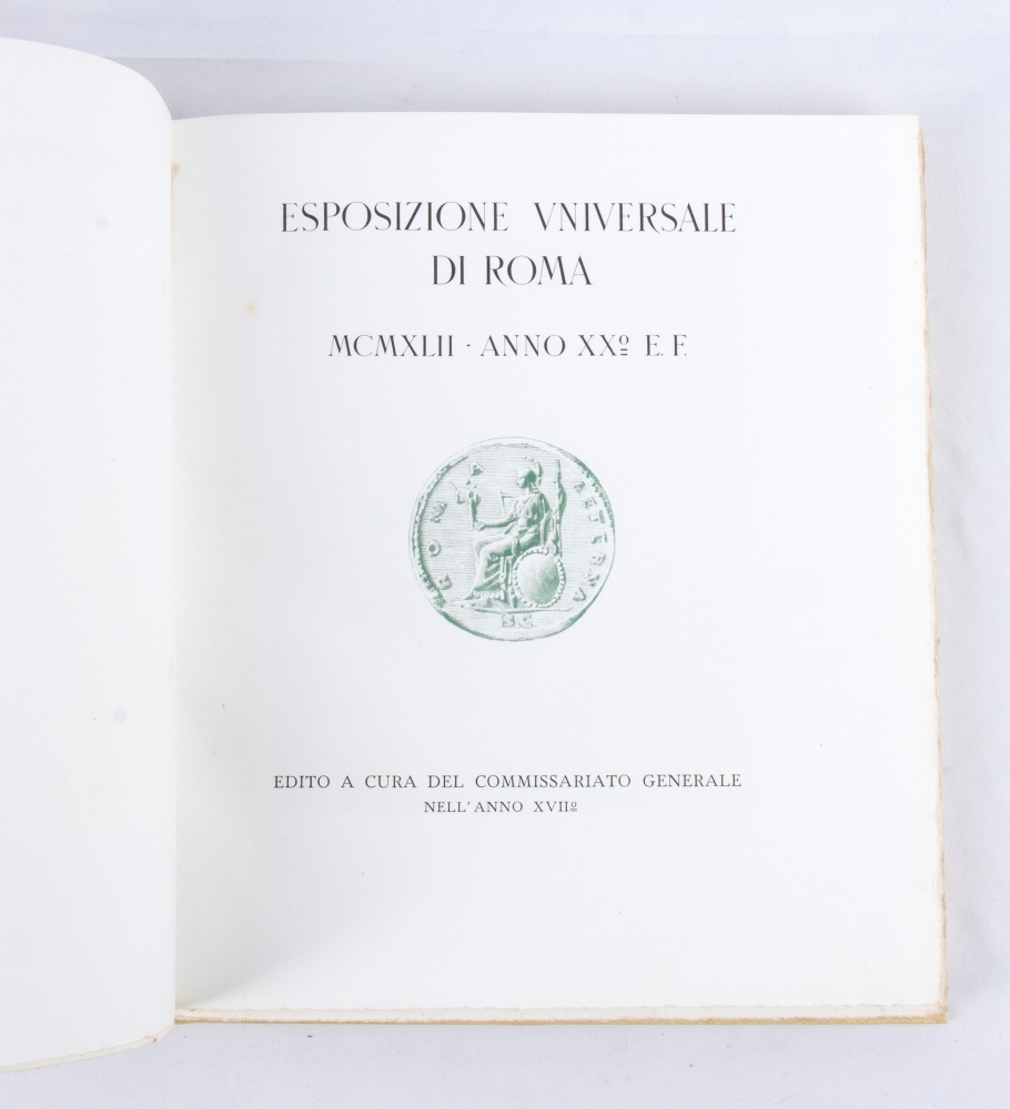 Legatura in piena pergamena con titoli e stemma impressi in oro, in custodia cartonata originale. 2 ritratti in seppia, 16 bellissime tavole a colori con progetti di Sironi, Quaroni, Dazzi ed altri. Completano ancora 10 illustrazioni e tavole b.n. n.t. Fra i collaboratori gli architetti Libera, Moretti, Muratori, La Padula, Michelucci, Figini e Pollini, Quaroni, Muzio e del Debbio. Il libro illustra il progetto della famosa "E 42" l'Esposizione Universale di Roma prevista per il 1942, che non fu mai realizzata a causa della guerra. Edizione originale. A cura del Commissariato Generale dell'Esposizione Universale di Roma. . MCMXLII Anno XX° E.F.